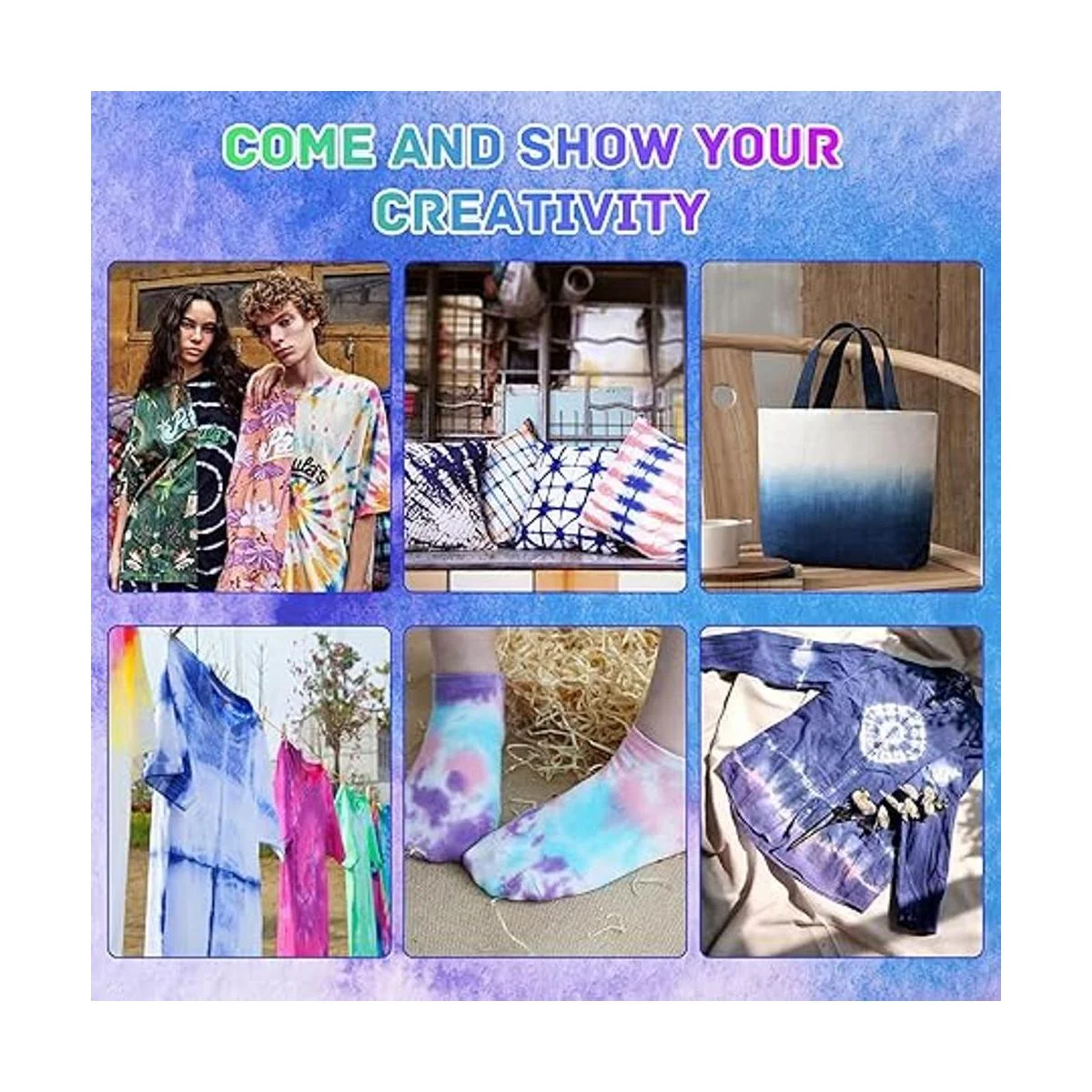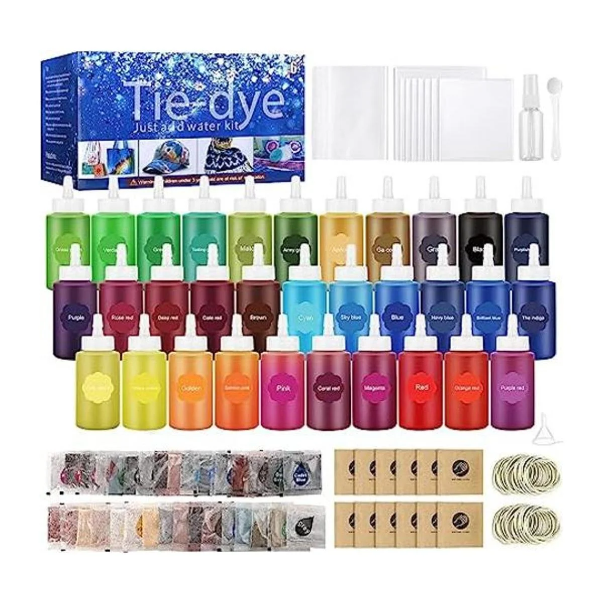 Todo en uno: el kit de arte de tinte de tela contiene 32 polvos de tinte y botellas, 100 bandas de goma, 10 guantes, 5 bolsas transparentes, 6 delantales, 1 embudo, 1 cuchara, 1 botella de spray, 1 mantel.