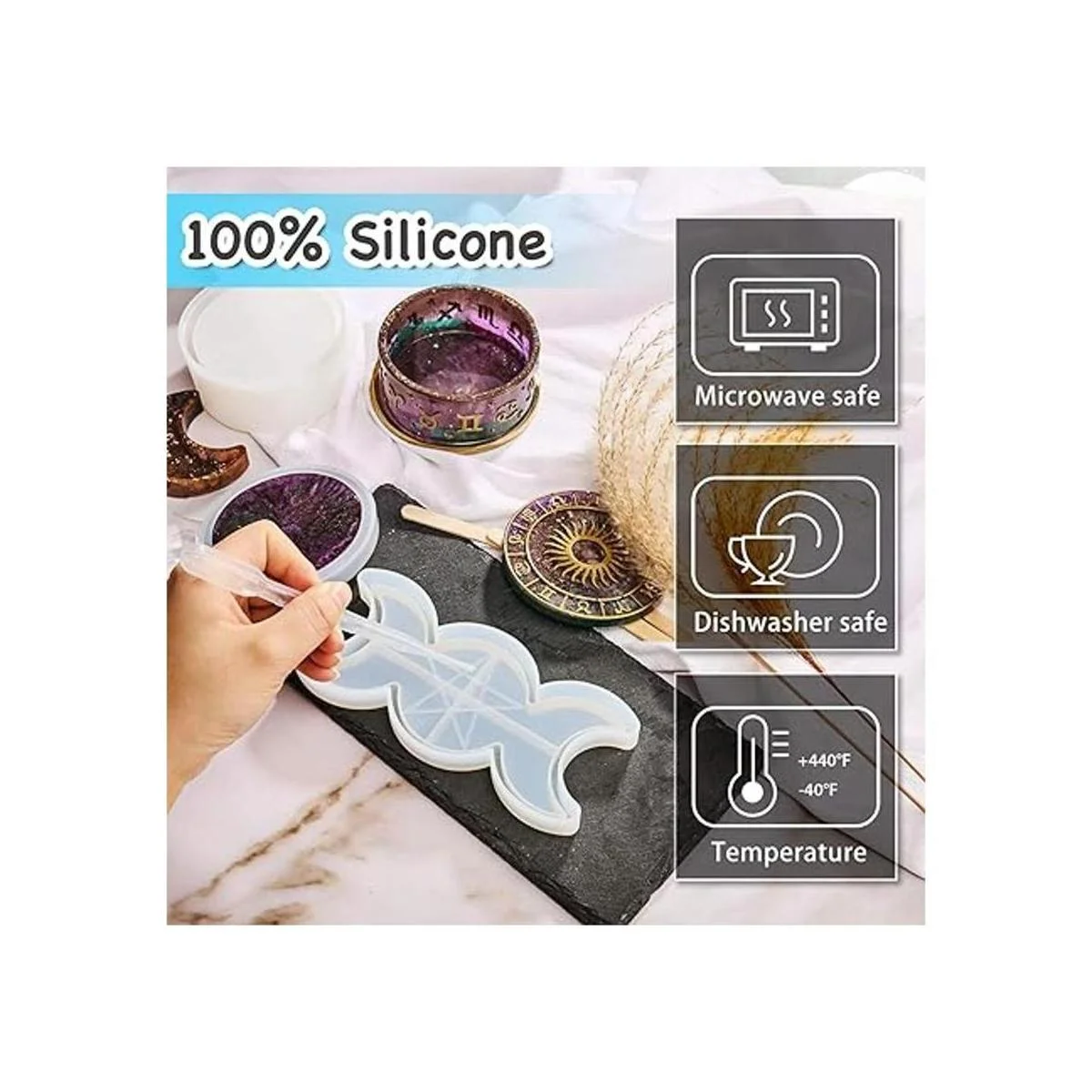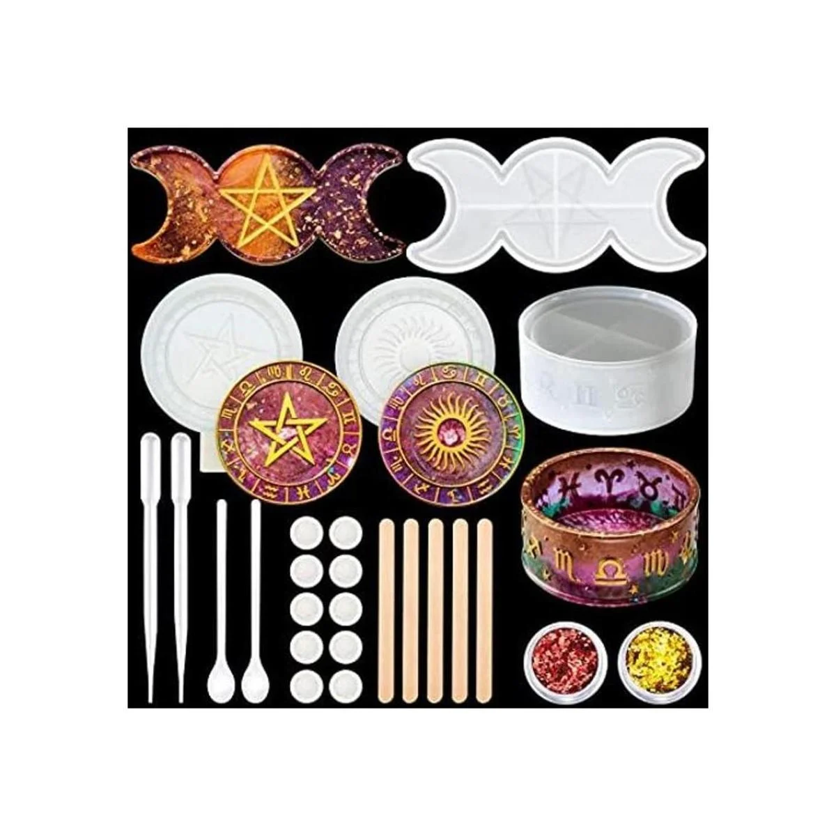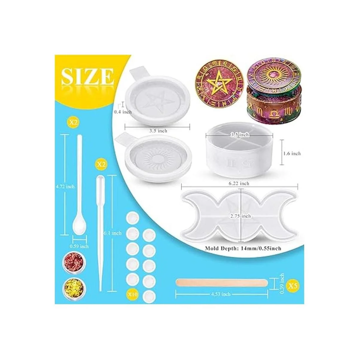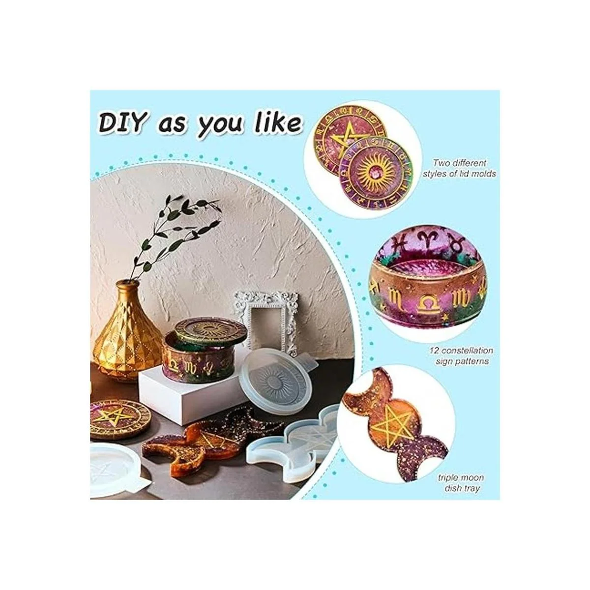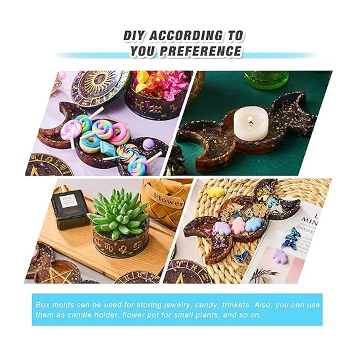Molde de caja de almacenamiento de resina, molde de bandeja de plato de triple luna, molde de silicona de bandeja de fase lunar, molde de caja de letrero de 12 constelaciones con 2 tapas de patrones diferentes, bandeja de triple luna, molde epoxi y juego de herramientas hechas a mano