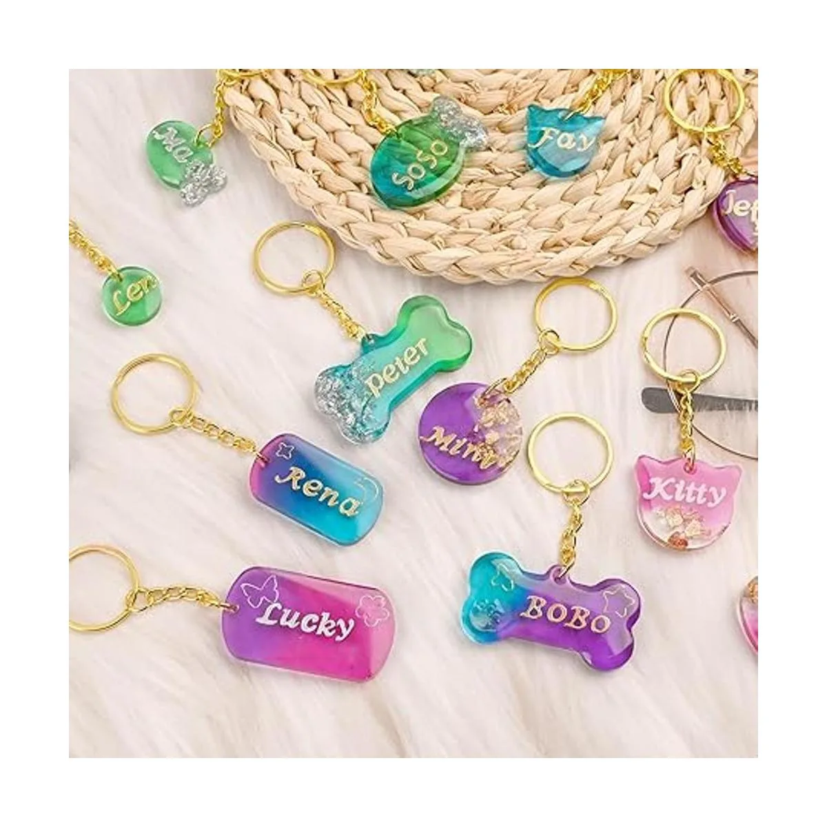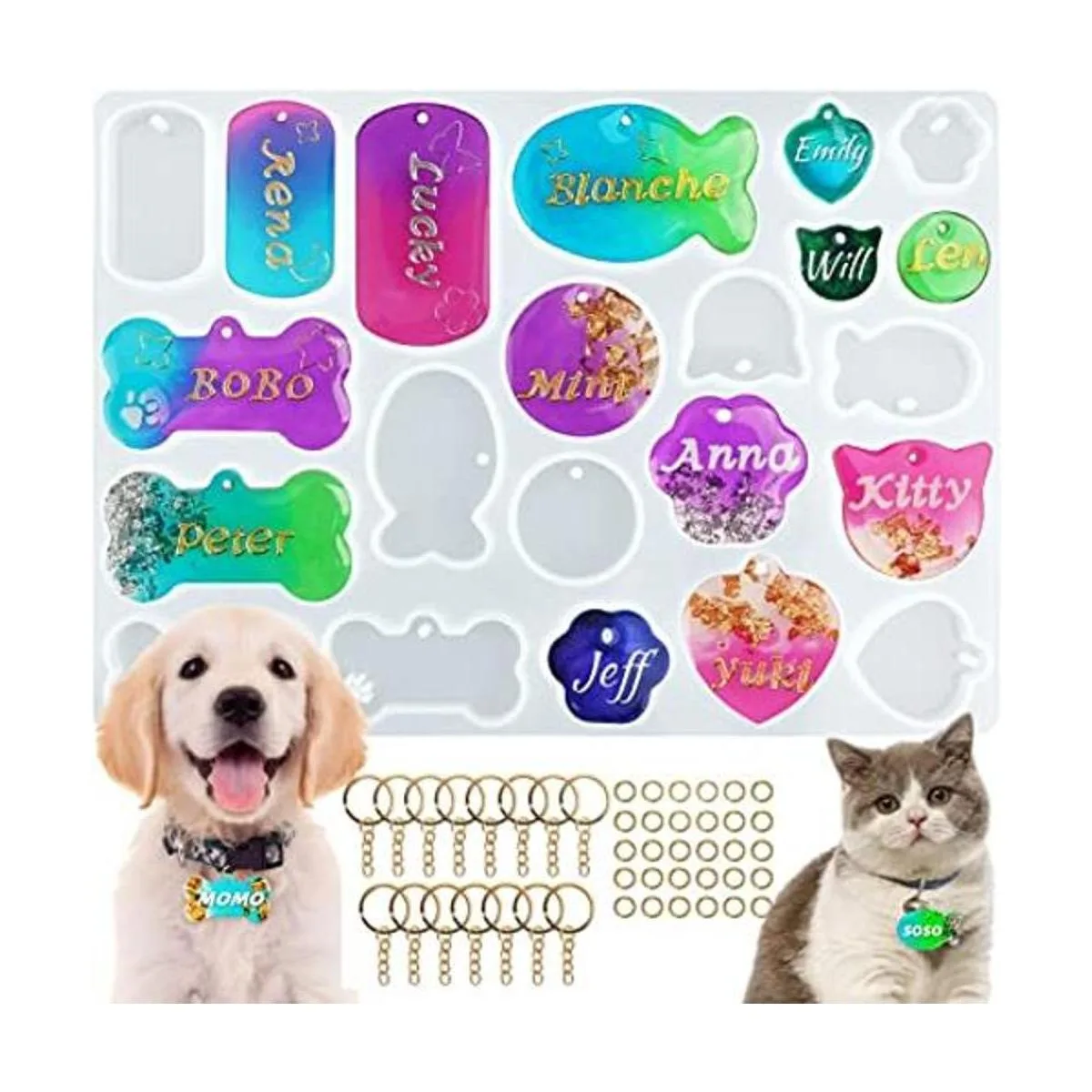 Diseño único: 22 moldes de etiquetas de diferentes tamaños adecuados para mascotas de diferentes tamaños. Todos los moldes de etiquetas de resina tienen un agujero ya colocado para un fácil etiquetado, no requiere taladro. Fácil de fijar en el llavero o colgarlo.