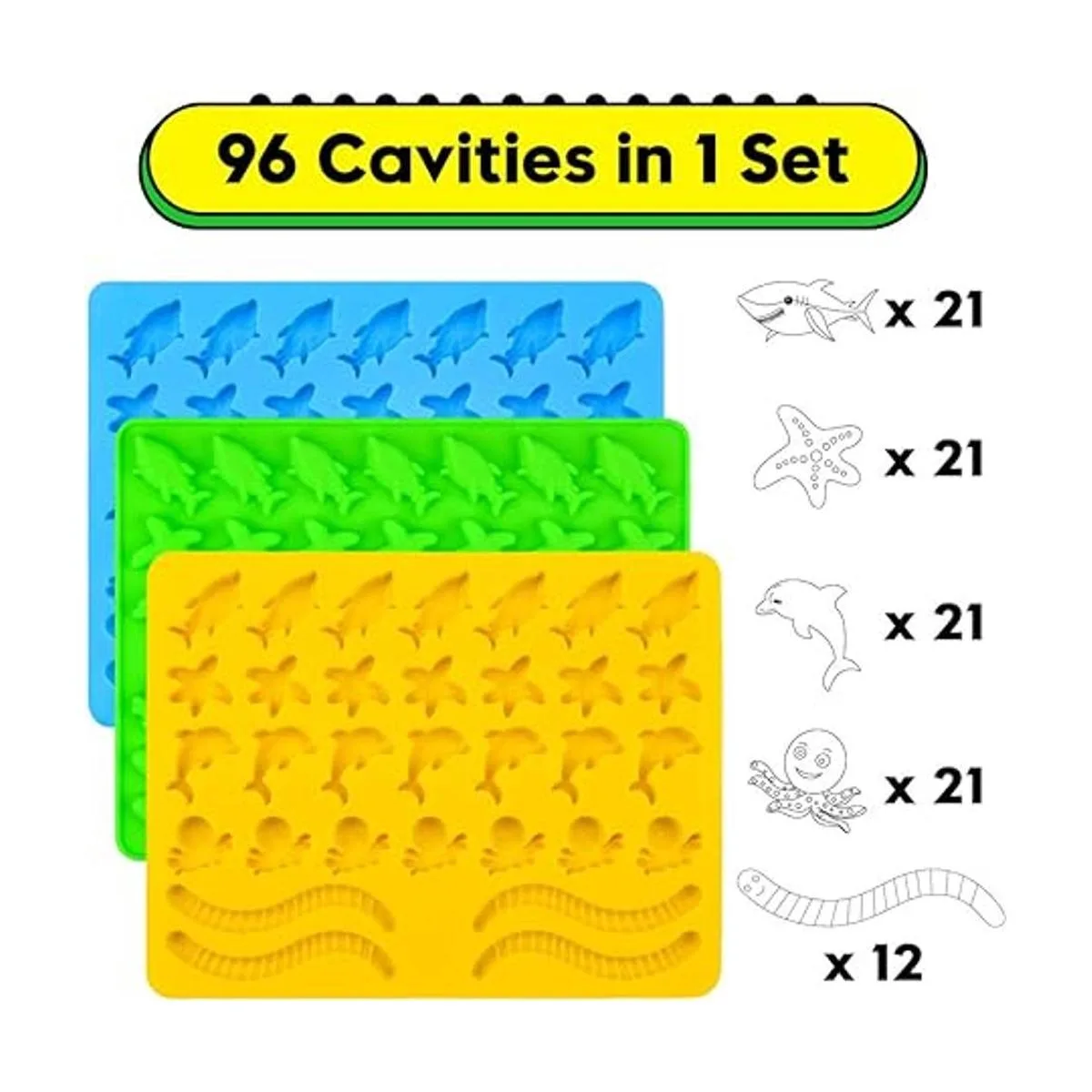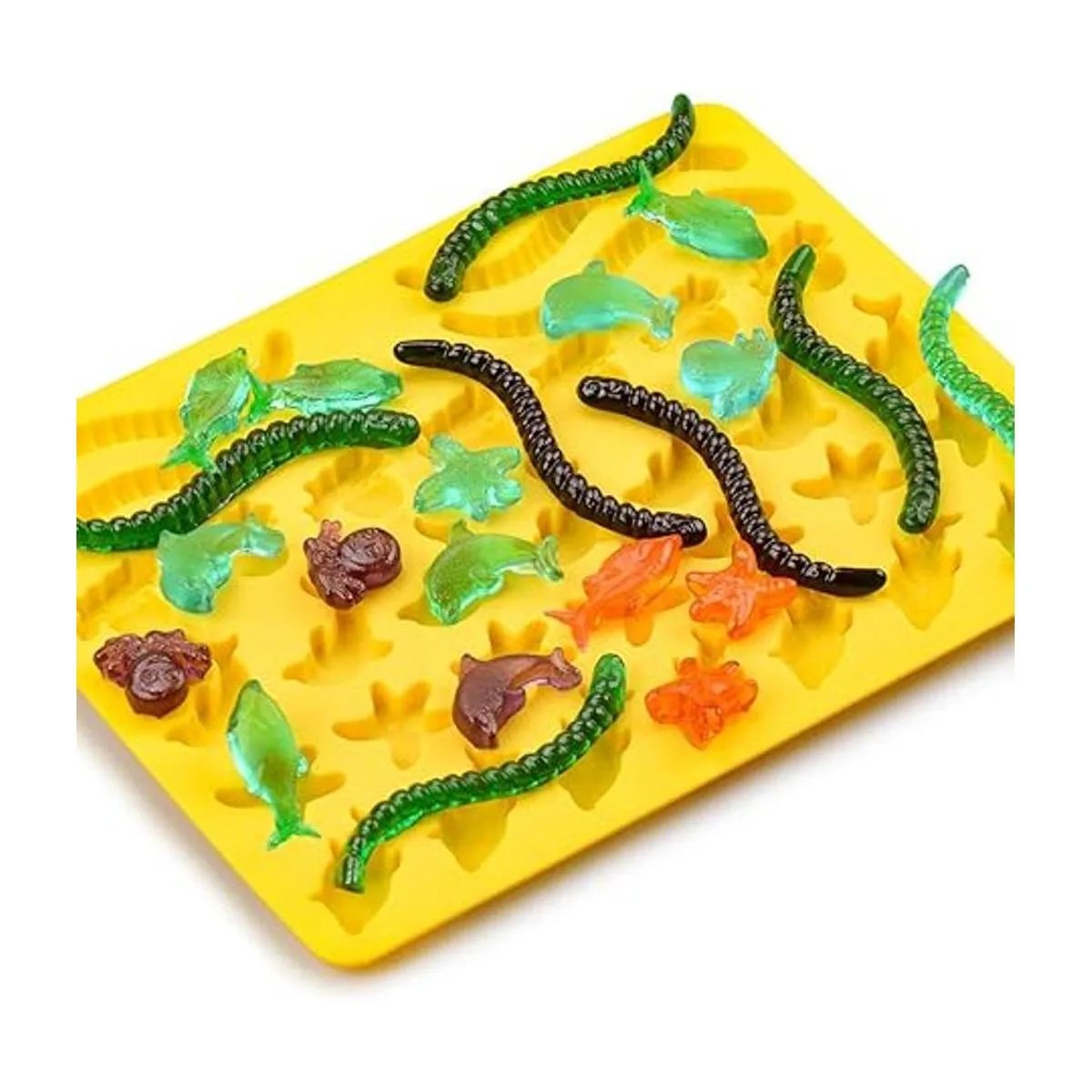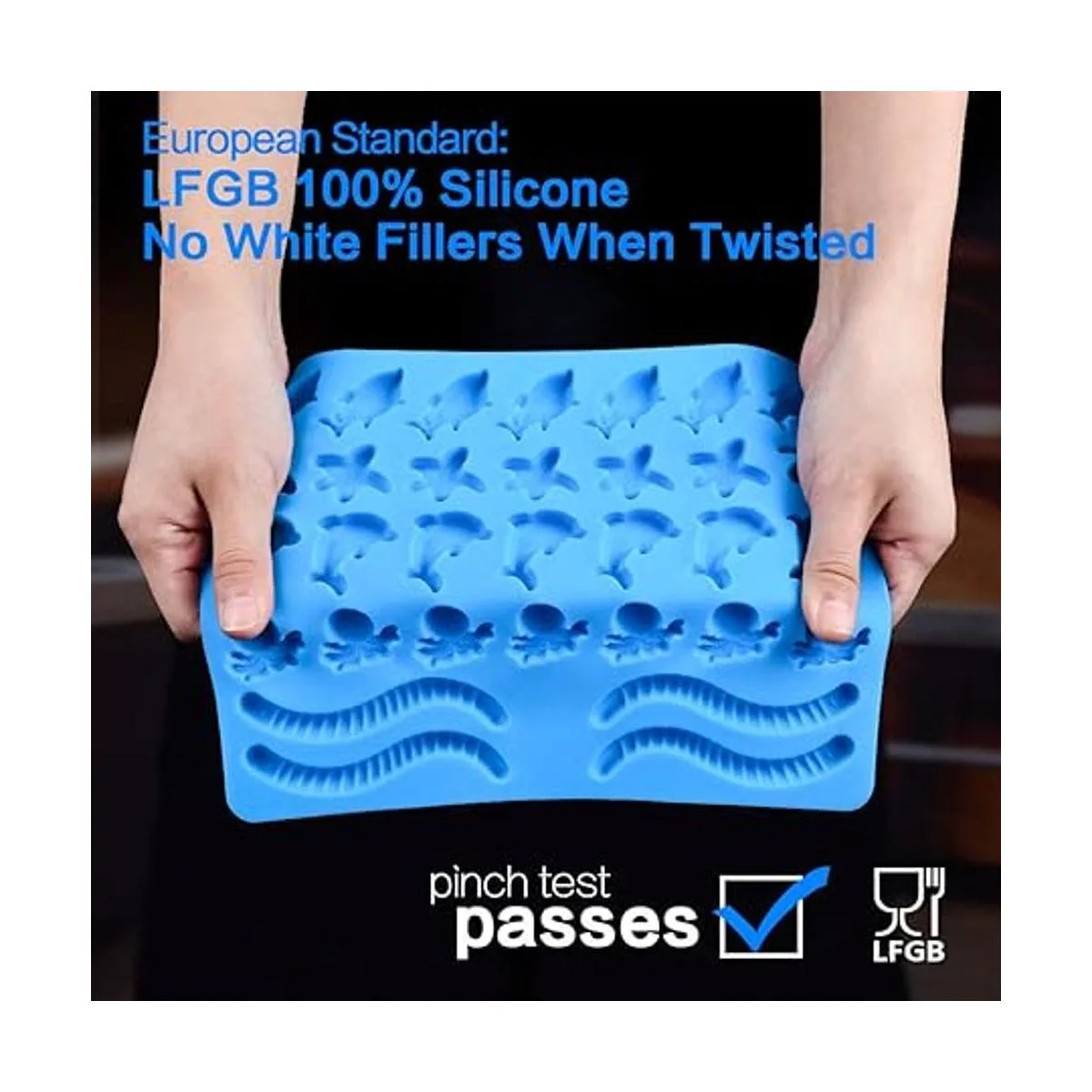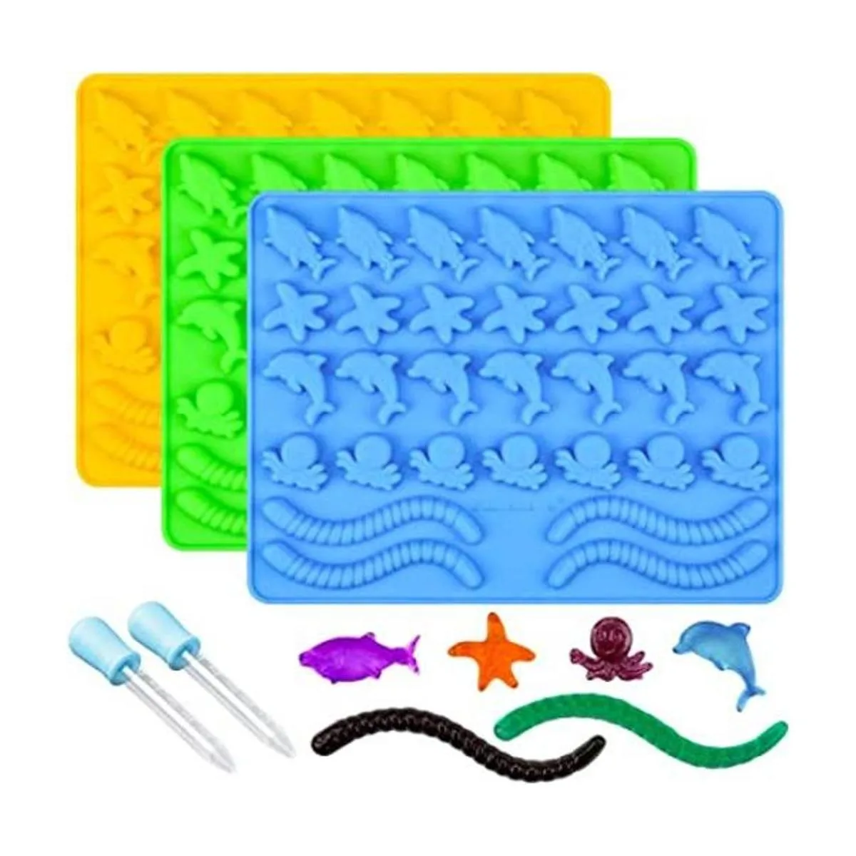 Moldes de goma para dulces duros Moldes de caramelo de silicona que incluyen gusanos, estrellas de mar, delfines, pulpo, tiburones, moho de mar sin BPA, prueba de pellizco, paquete de 3 moldes de océano