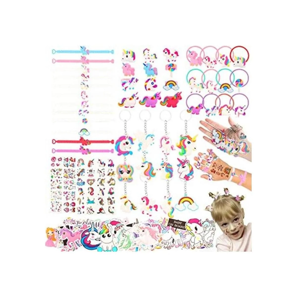 Moncinday Paquete de 133 recuerdos de fiesta de unicornio, suministros de fiesta de unicornio para niños, decoración de fiesta de cumpleaños con temática de unicornio, anillos de pelo de unicornio, llaveros de unicornio, calcomanías, tatuajes de unicornio para bolsas de golosinas de unicornio, rellenos, premios de carnaval, relleno de piñata