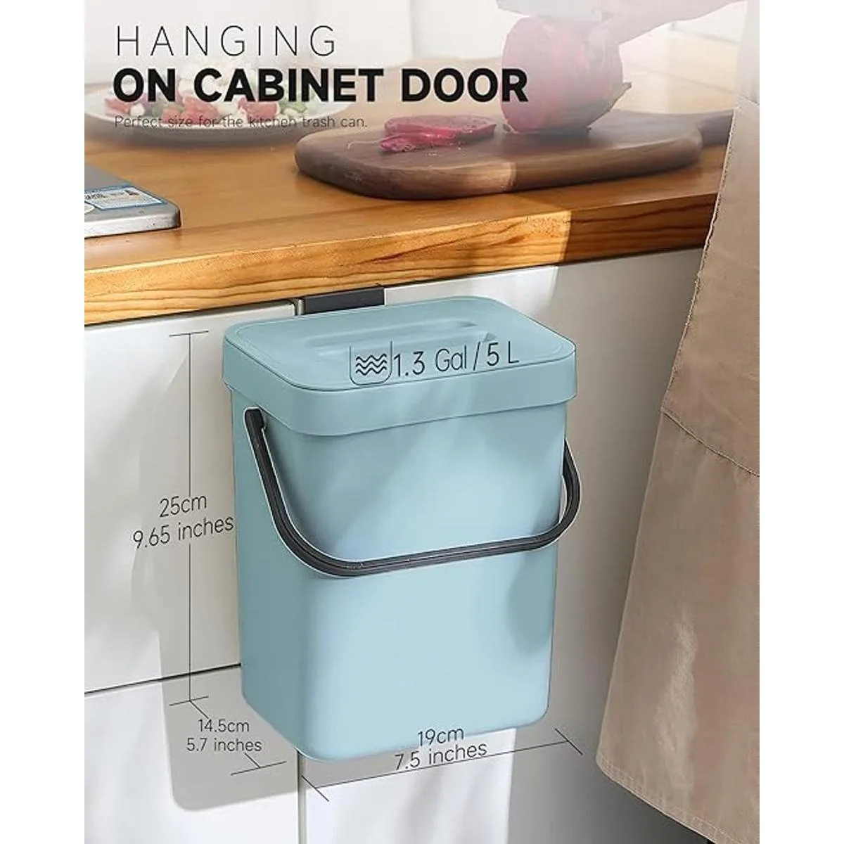 Pequeño y exquisito Capacidad de 5 litros. Medidas: 7.5 5.7 9.6 pulgadas. Los cubos de basura son compactos y ahorran espacio. El cubo de basura se puede fijar a cualquier puerta de armario o simplemente colocar en la encimera.