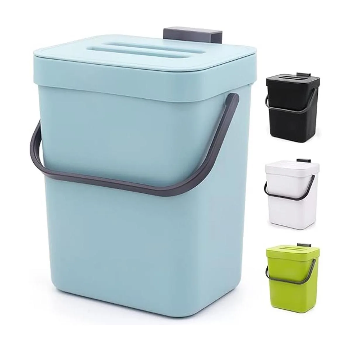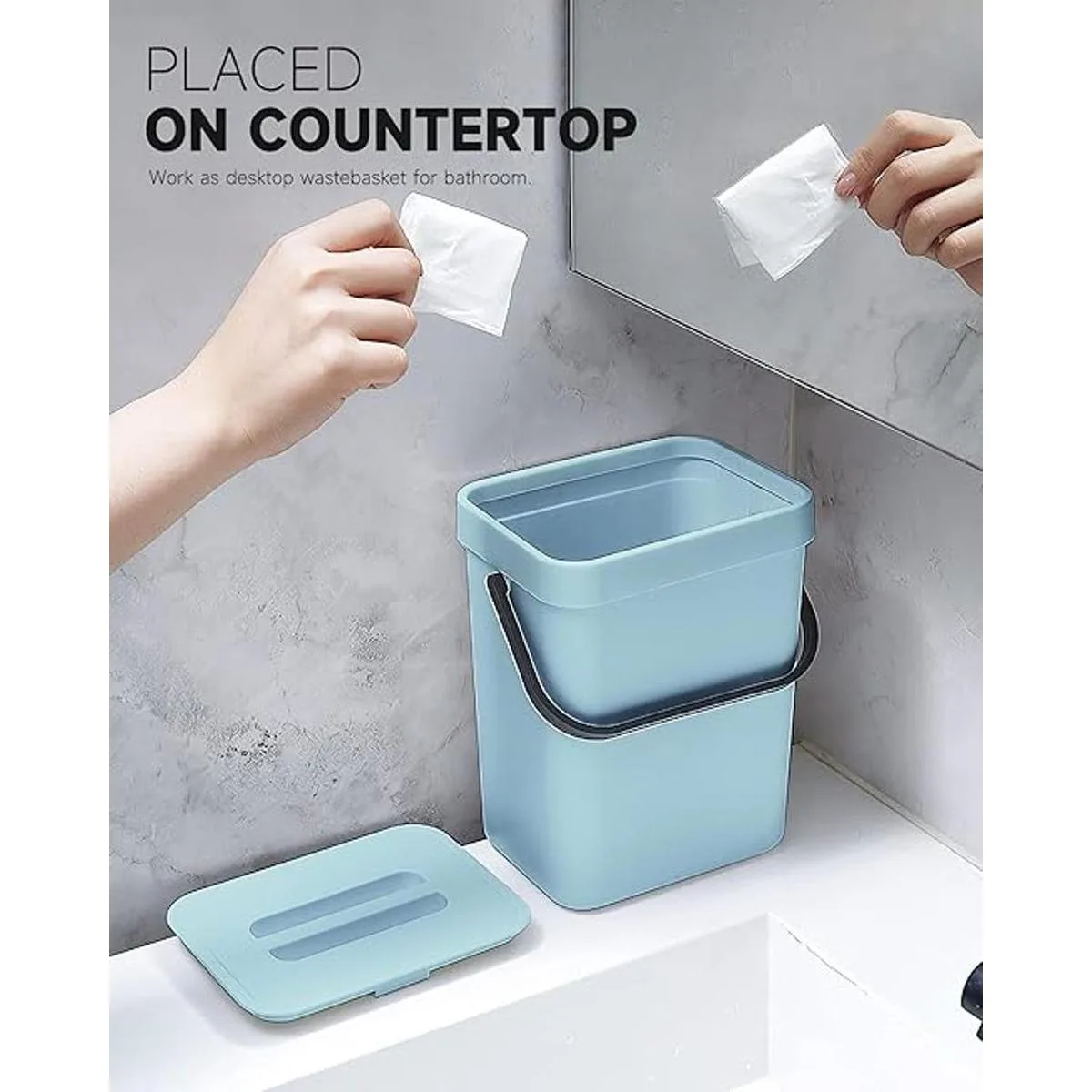 MONGTINGLU Bote de basura pequeño de 1.3 galones con tapa, contenedor de compost para encimera, bote de basura colgante de cocina para puerta de gabinetedebajo del fregadero, bote de basura pequeño para escritorio, 5L azul sutil