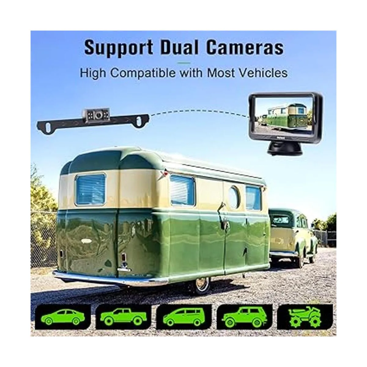 Plug and Play Cámara de respaldo para camión simplemente alimentada por una fuente de alimentación. Primera manera: cámara de visión trasera y monitor alimentados por el adaptador del encendedor de cigarrillos para uso continuo/marcha atrás. Segunda manera: alimentado por luces de marcha atrás o luces de marcha para un uso continuo de conducción o marcha atrás.