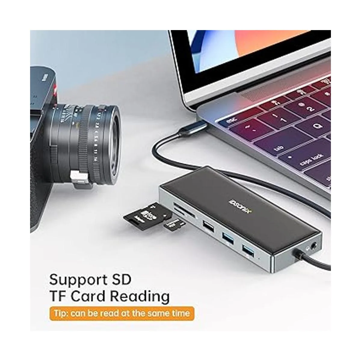 Estación de acoplamiento 12 en 1 monitor dual: puede ampliar tu computadora de 1 puerto tipo C a 12 puertos multifunción, estación de acoplamiento con 2 HDMI 4K, DisplayPort 4K, PD 100W, USBA3.1 2, USBA2.0 2, SD/TF, RJ451, audio de 0.138 in. Todos los puertos USB Hub pueden funcionar al mismo tiempo, perfectamente compatibles con tu computadora