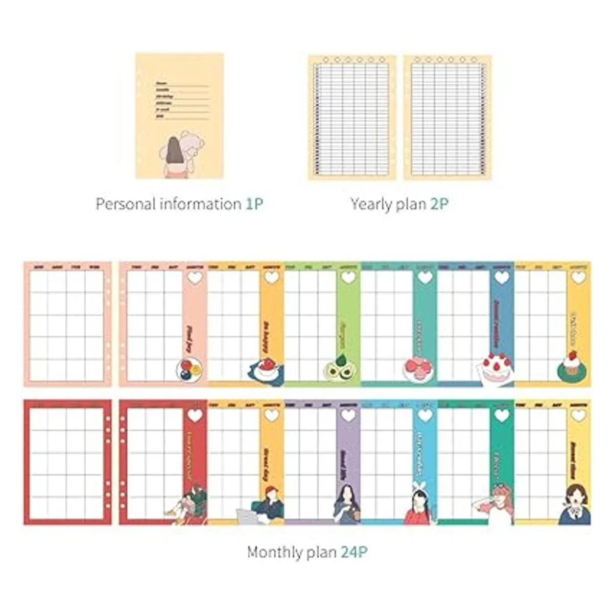 Configuración de la página interior: página de información personal, página de plan anual 2, página de plan mensual 24, página de plan semanal 106, página de notas gratis 40, página de ilustración 19, total de 192 páginas