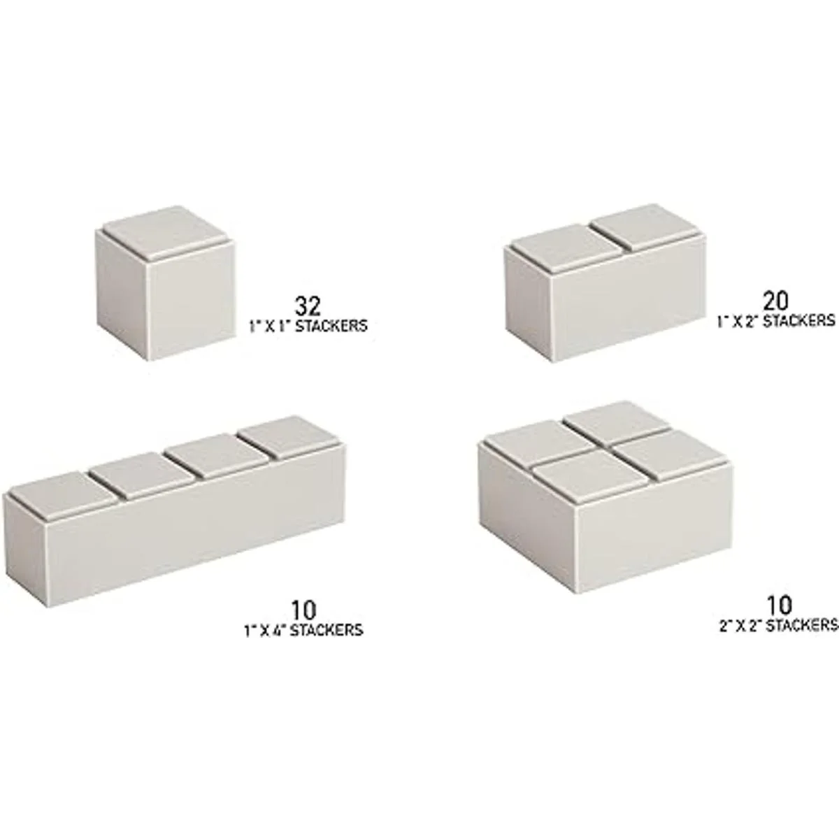 Pieces include 32 1×1 stacker, 20 1×2 stacker, 10 1×4 stacker, and 10 2×2 stacker