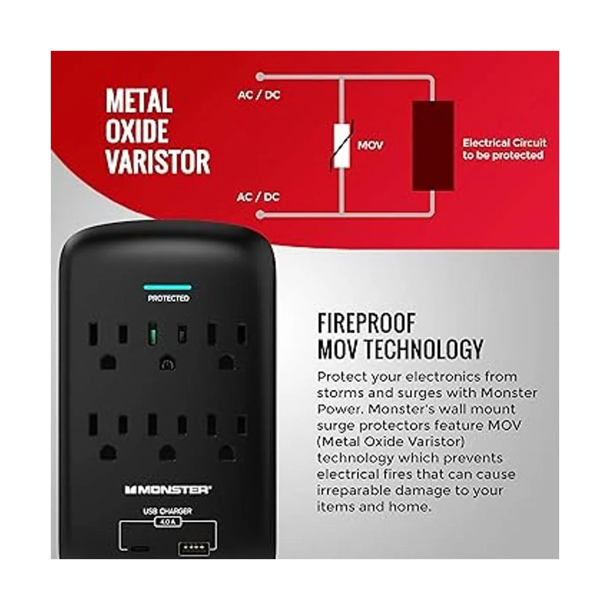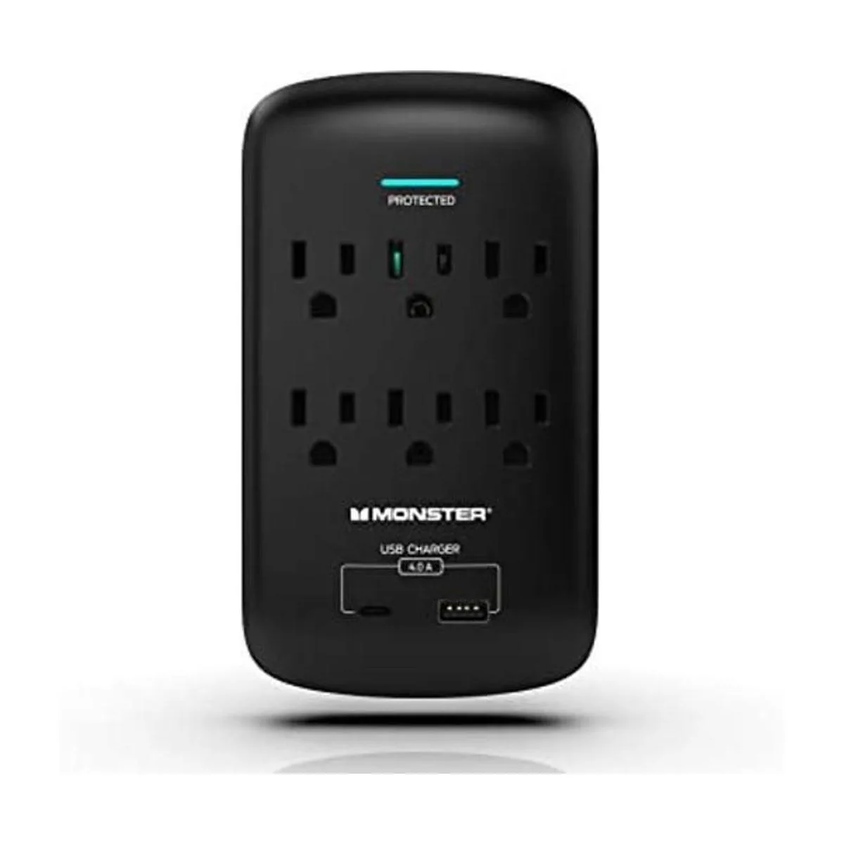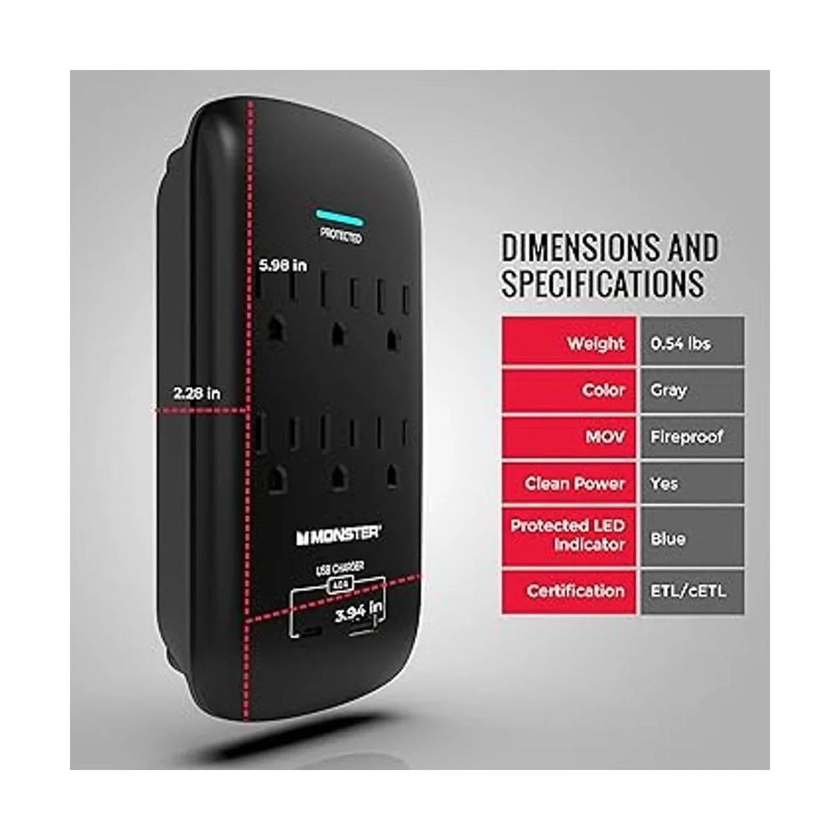 Monster Protector de sobretensiones de alimentación para grifo de pared, protección resistente con hasta 6 CA, 1 puerto USBC y 1 puerto USBA, ideal para computadoras, electrodomésticos y equipos de oficina, negro, 6 salidas y 2 puertos USB