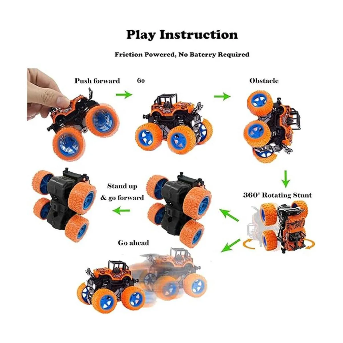Funny 360 Degrees Rotating Stunt :Just lightly push the monster trucks hard to make the wheels working and put the toy cars upside down on the ground. You will see the car rotate 360 degrees in a loop and go ahead. Easy to operate, and will bring hours of fun to your children.