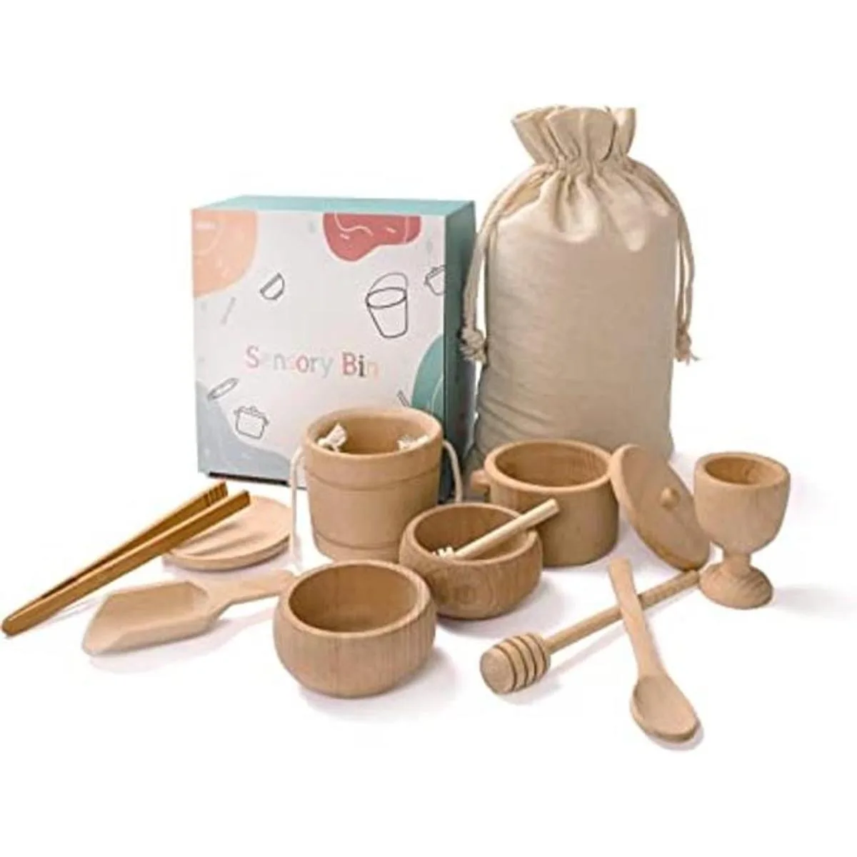 MONT PLEASANT Montessori Toys Contenedores sensoriales para niños pequeños de 1 año, 11 piezas de madera Waldorf, cucharadas y pinzas de madera para trabajo de transferencia y desarrollo de habilidades motoras finas