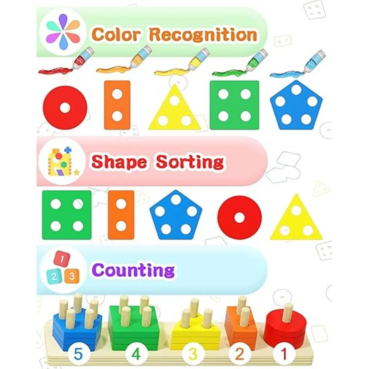 Seguridad y alta calidad: los juguetes para niños pequeños incluyen piezas de madera gruesas de alta calidad para garantizar que las manos pequeñas puedan agarrar fácilmente las piezas y completar el rompecabezas apilable. Los bordes del juguete de clasificación Montessori son suaves y las clavijas son resistentes, los bloques están cubiertos con pintura segura para alimentos que no es tóxica, inodoro y antidecoloración, mantiene a tus niños y niñas de 1, 2 y 3 años juegan de forma segura. A tus hijos les encantarán las piezas grandes y gruesas de este juguete para niños, que son fáciles de manejar y montar.