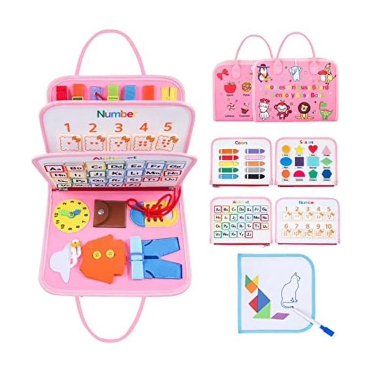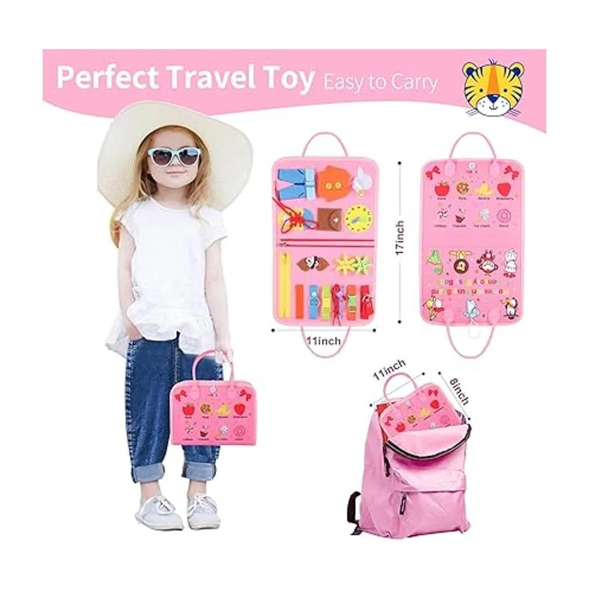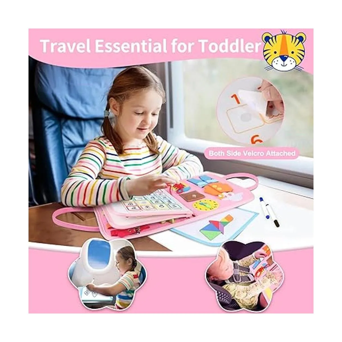Montessori Tabla de actividades sensoriales para habilidades motoras finas, artículos esenciales de viaje en avión para niños y niñas rosa