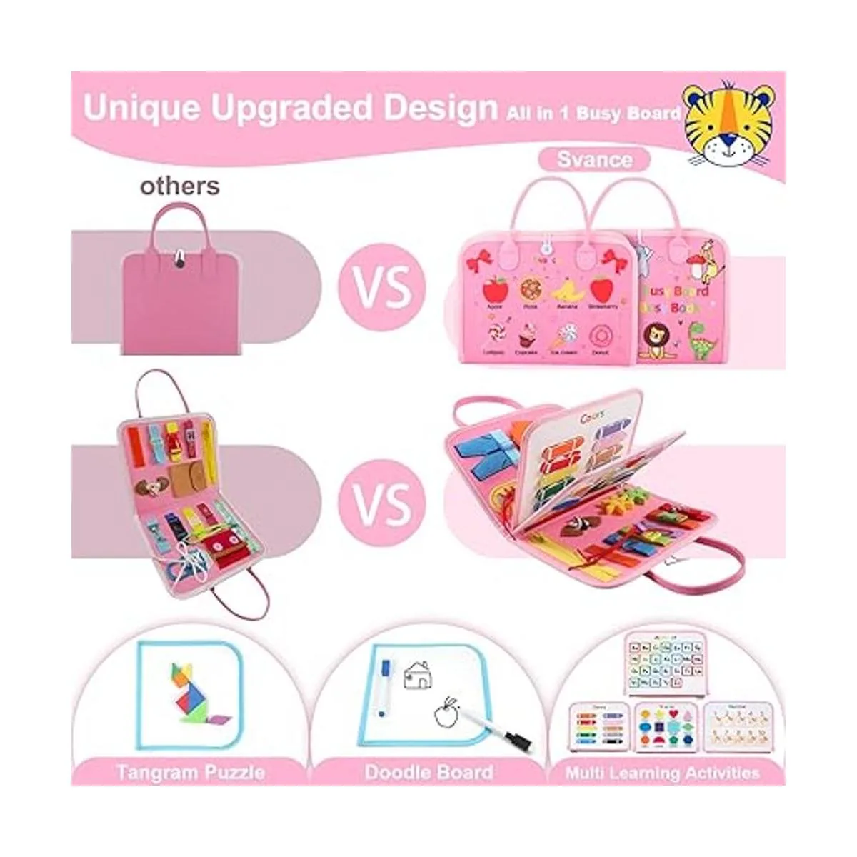 Juguetes Montessori de diseño único: en comparación con otras tablas ocupadas, los juguetes sensoriales Svance Montessori añaden un rompecabezas de tangrama de diseño especial, tablero de garabatos con 2 bolígrafos, bonito lazo, deliciosa comida y patrón de animales que son atractivos para las niñas