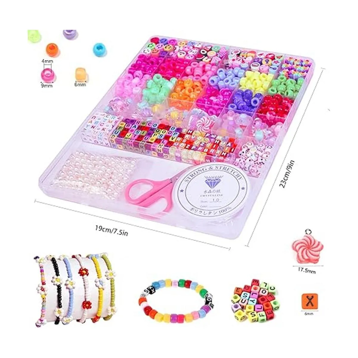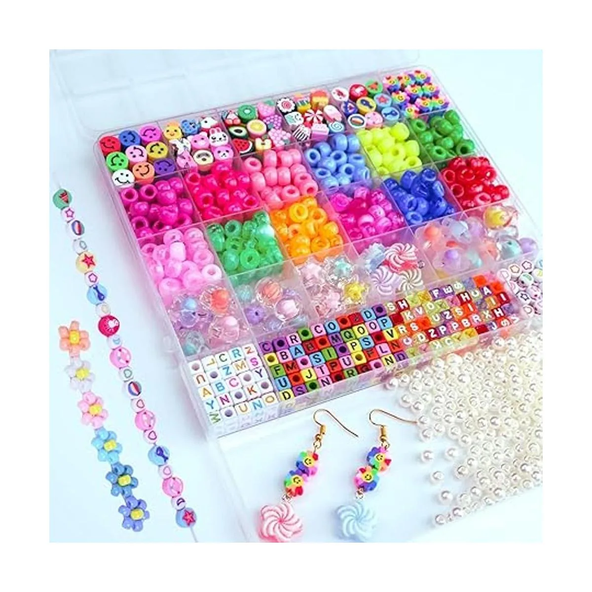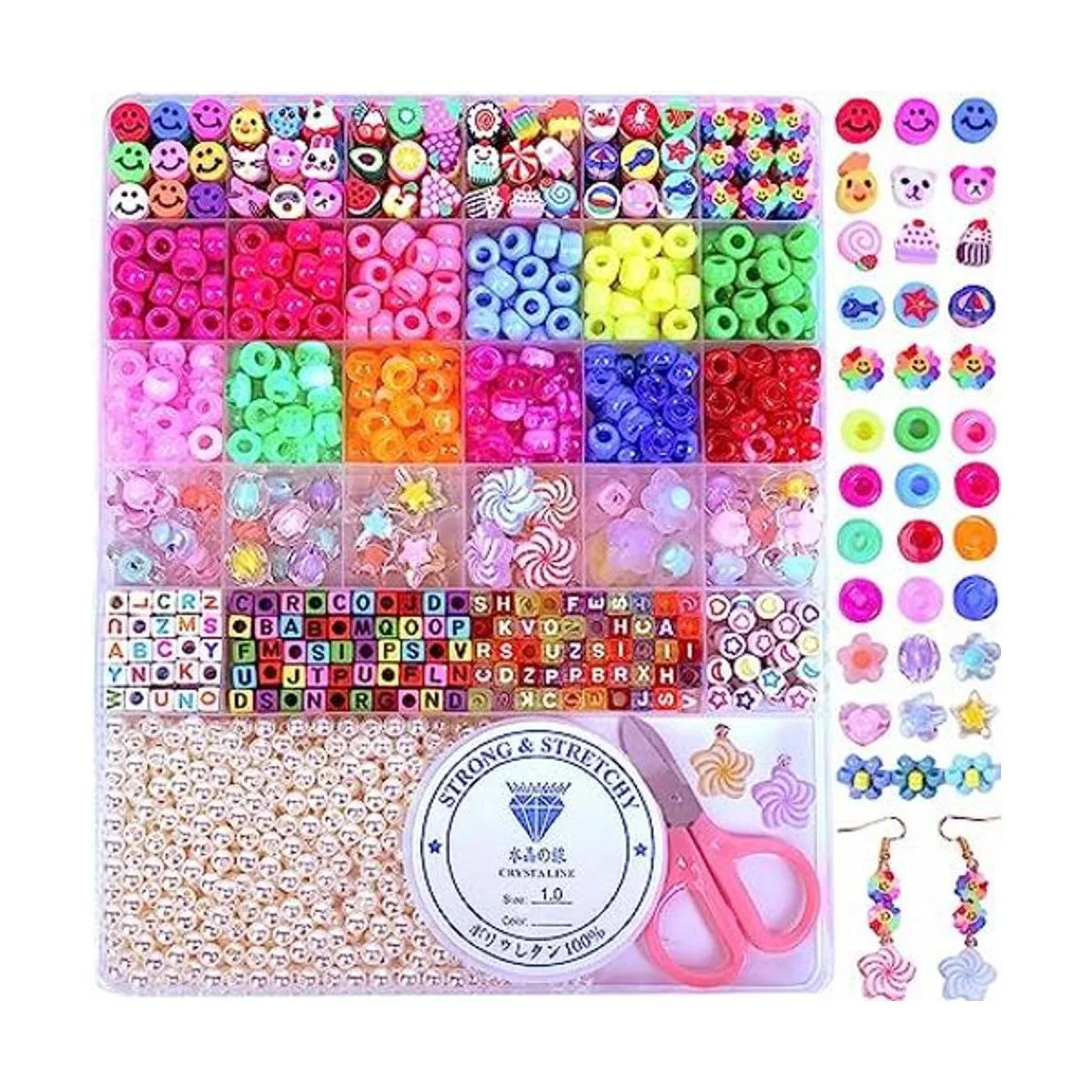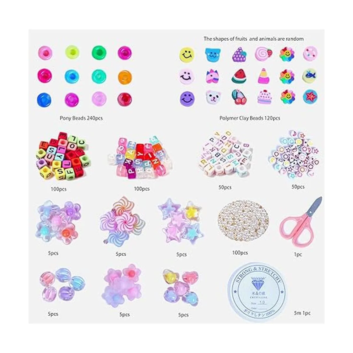 Kit único de fabricación de pulseras: 120 cuentas de arcilla polimérica, 240 cuentas de pony, 250 cuentas de letras cuadradas, 100 perlas de imitación, 30 bonitas cuentas acrílicas macaron, 50 cuentas redondas mixtas de luna, estrella y flores. El kit de cuentas también está equipado con un rollo de cuerdas elásticas de cristal de 16.4 ft y un par de tijeras pequeñas, un gran kit de fabricación de pulseras de cuentas.