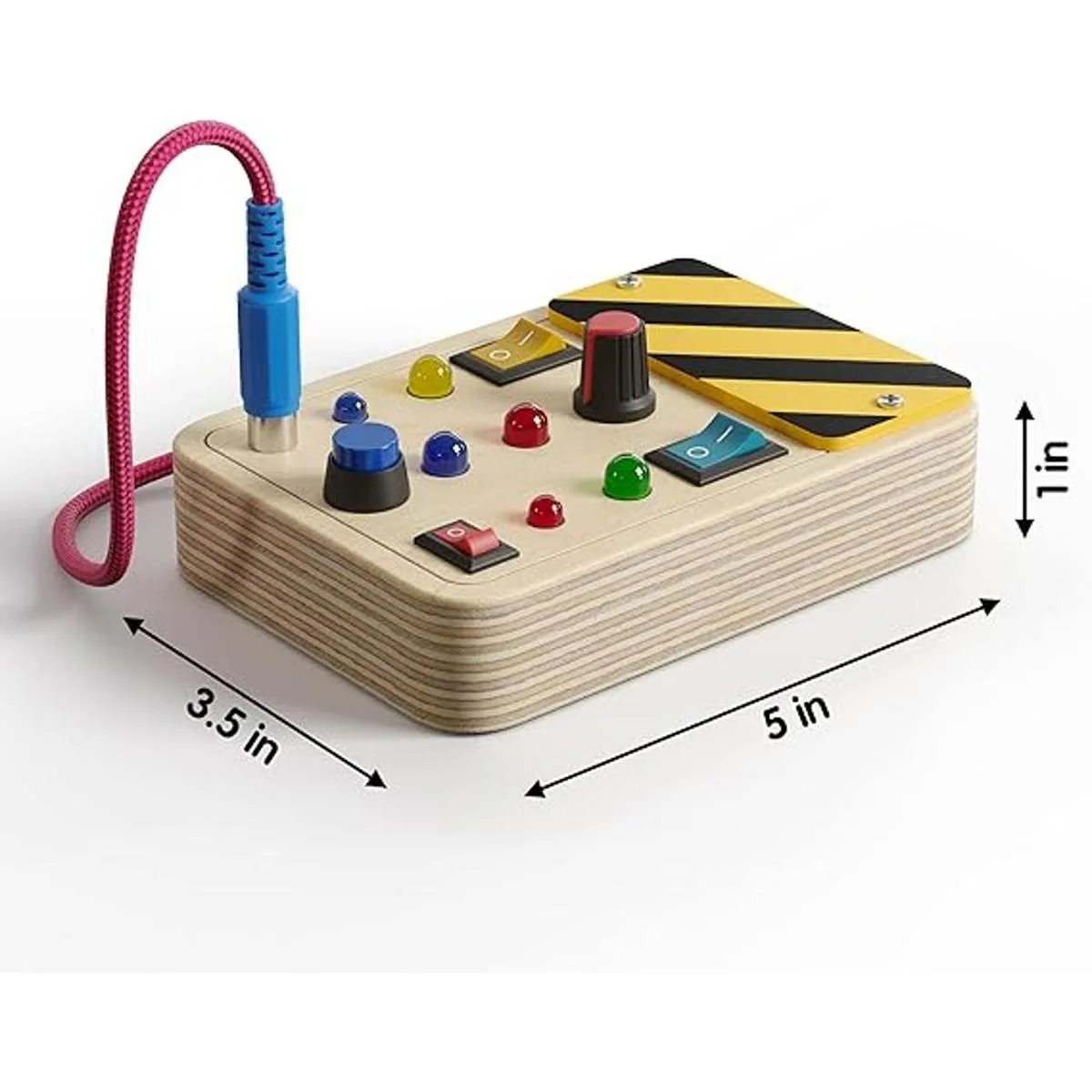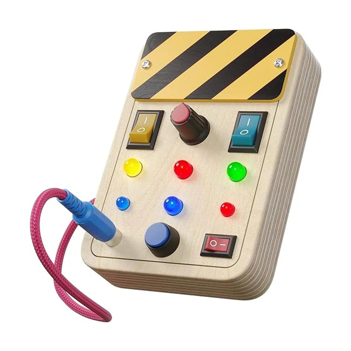 Montotoys Tablero ocupado para niños pequeños, juguetes sensoriales de madera para niños pequeños, juguetes para niños autistas con botones de luz LED, cables enchufables, regalos para bebés, juguete educativo de aprendizaje
