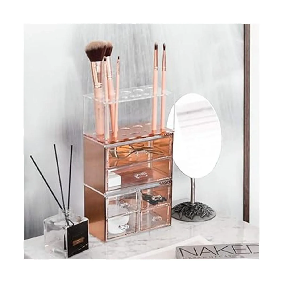 El organizador está hecho de acrílico transparente con el perfecto piel de color oro rosa o dorado. Usted puede comprobar el contenido desde el lado transparente. Y diseñamos el patrón en la superficie de la piel para tener una mejor efecto visual en su computadora, en su habitación.