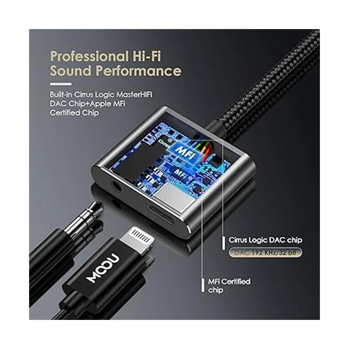 Certificado Apple MFi El adaptador divisor MOOU 2 en 1 para iPhone está certificado por Apple para cumplir con los estrictos requisitos de compatibilidad de iPhone/iPad y garantizar una conexión completamente segura con tu dispositivo Apple.