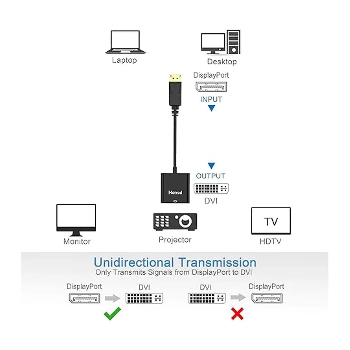 Diseño compacto: el adaptador portátil Moread DP a DVI conecta un escritorio o portátil con puerto de pantalla DP, DisplayPort, DP a un monitor, pantalla, proyector o HDTV con entrada DVI; mete este dispositivo ligero en tu bolsa o bolsillo para hacer presentación de negocios, o extiende tu espacio de trabajo para aumentar la productividad; se requiere un cable DVI se vende por separado