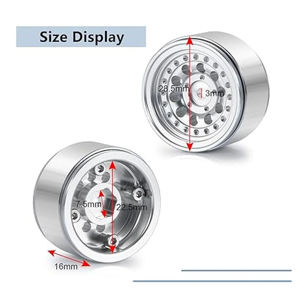 Accesorios de alta calidad para coches a control remoto: las llantas de aluminio de aleación de alta calidad lo harán más duradero. La actualización ligera mejora al instante el rendimiento general y la capacidad de disipación de calor es fuerte. El juego de llantas de metal SCX24 Upgrades incluye 4 llantas de 1/24 RC solamente.