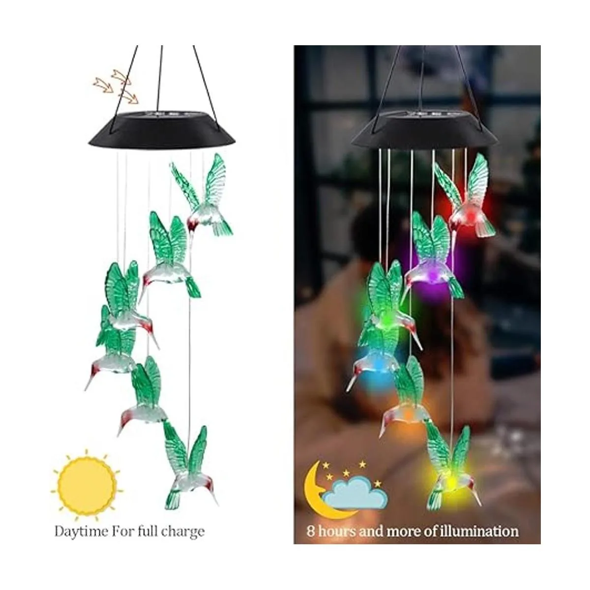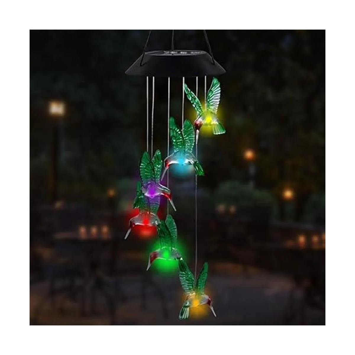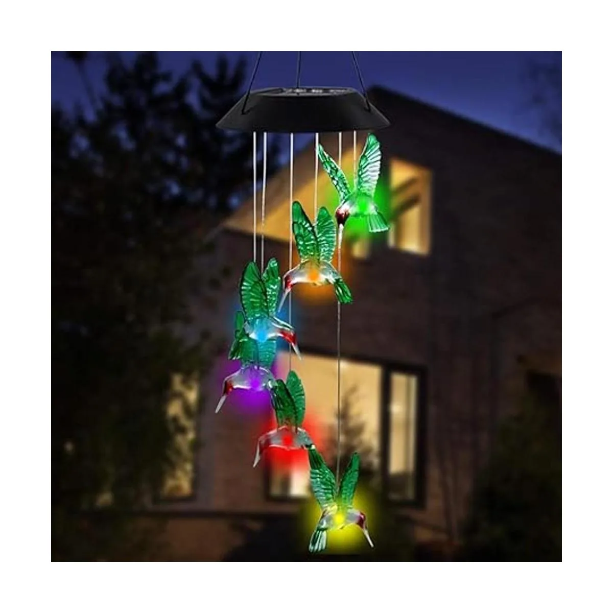 Decoración nocturna brillante: cada colibrí cuenta con una bombilla LED que cambia de color, por lo que puede cambiar de un color a otro suavemente. El vidrio de alta calidad es brillante y translúcido. Con luz parpadeante, nuestro carillón de viento de colibrí crea un ambiente romántico.