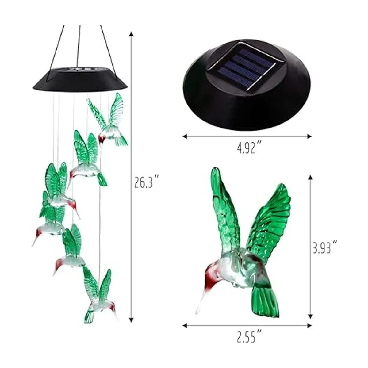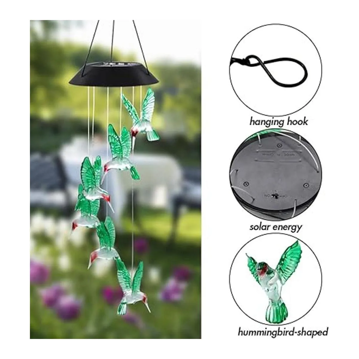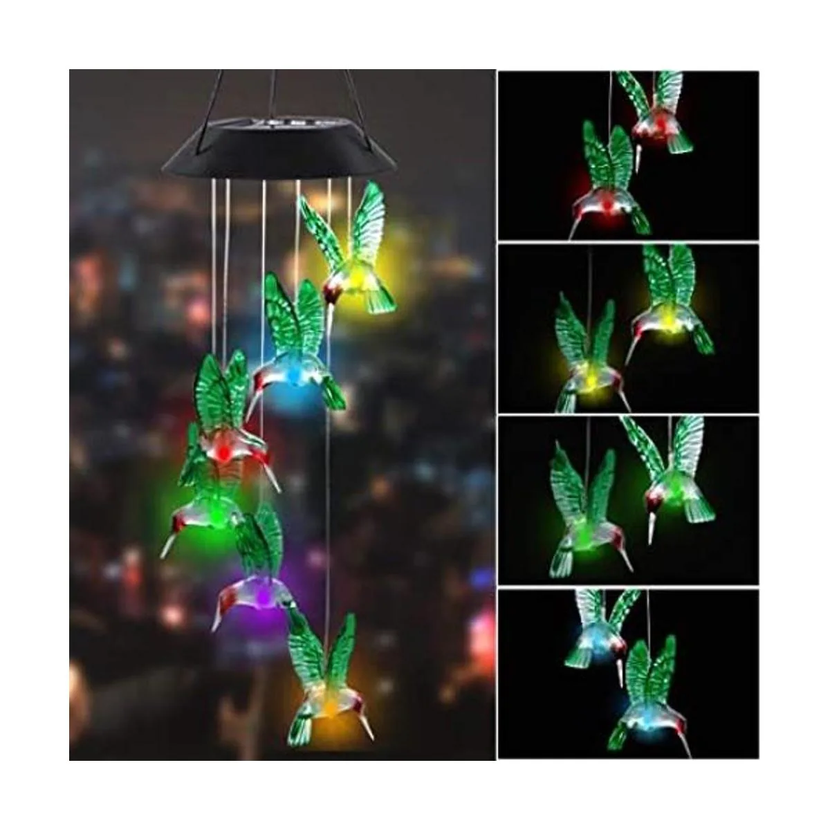Decoración nocturna brillante: cada colibrí cuenta con una bombilla LED que cambia de color, por lo que puede cambiar de un color a otro suavemente. El vidrio de alta calidad es brillante y translúcido. Con luz parpadeante, nuestro carillón de viento de colibrí crea un ambiente romántico.