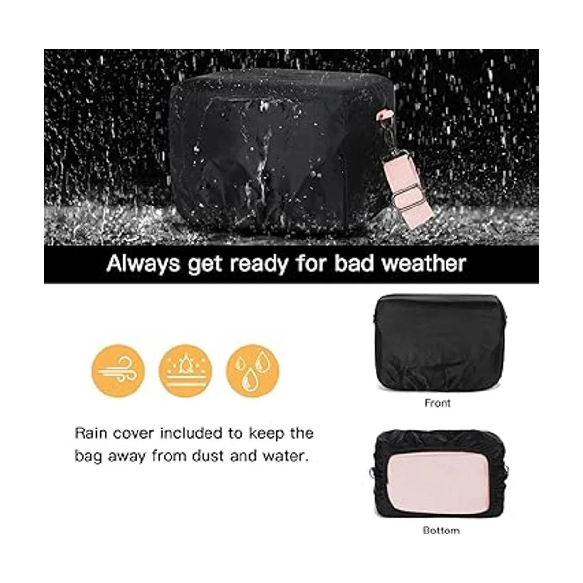 Fabricado con lona duradera y material de piel sintética. La cubierta impermeable para la lluvia incluida puede proteger completamente toda la bolsa del agua de lluvia, mantiene tus pertenencias no mojadas. La cubierta de solapa de piel sintética con diseño de almohadilla interior es simple y elegante, protege tu cámara de daños accidentales e impactos. El cinturón trasero hace que sea conveniente durante el viaje, perfectamente utilizado para viajes al aire libre, bodas, fotografía, vlog.