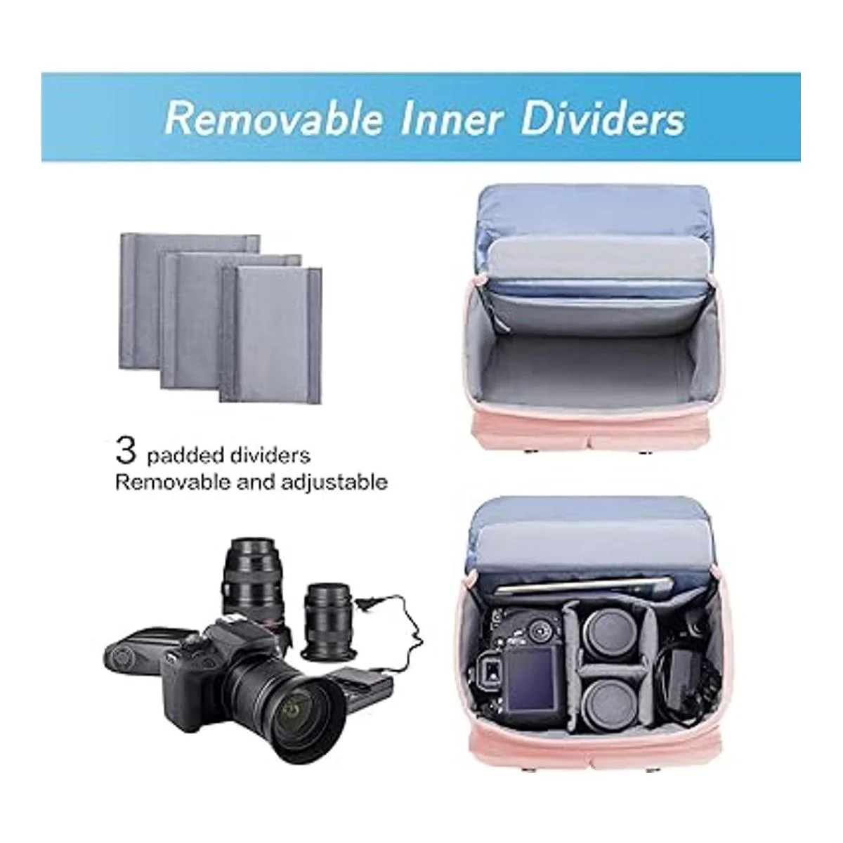 Tres insertos modulares extraíbles están diseñados como separadores personalizados para diferentes cámaras, flashes, lentes y otros equipos de cámara. El cliente puede ajustar el espacio interior en función de sus necesidades. La capa de espuma suave rodeada puede proteger bien tu cámara y accesorios de arañazos accidentales, proporciona una buena amortiguación y protección a tus cosas internas contra golpes, golpes y caídas. 1 bolsillo oculto antirrobo con cremallera en la parte posterior para tu teléfono, cartera y otros artículos preciosos.