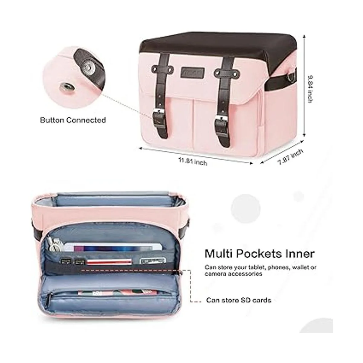 Múltiples bolsillos para su uso. 1 bolsillo interior acolchado y 1 bolsillo frontal con cremallera están diseñados para que puedas acceder a algunos artículos de uso frecuente convenientemente, como tu teléfono, tablet, cartera, cables, tarjetas SD, banco de energía y otros objetos pequeños.