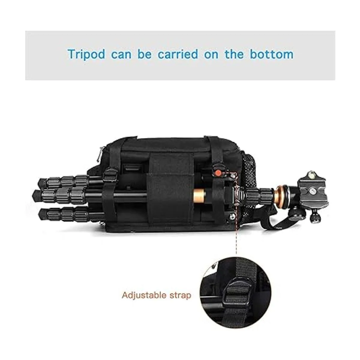 El soporte para trípode se presenta en una red de malla. Otros artículos más pequeños se pueden guardar en otro lado bolsa pequeña con cremallera. 2 partes en la parte posterior, 1 bolsillo oculto antirrobo con cremallera en la parte posterior para tus objetos preciosos, 1 bolsa vertical con cremallera puede almacenar la cubierta de lluvia que viene con esta bolsa de cámara