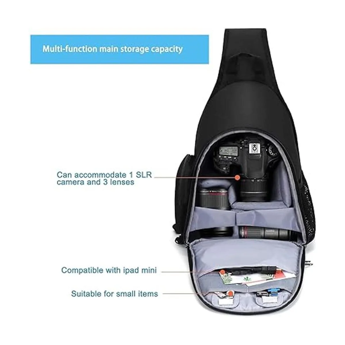3 partes en la parte delantera: la caja de almacenamiento interior principal más grande con cinturón dimensión interior: 12.5 x 8.2 x 4.1 pulgadas está separada con inserciones extraíbles modulares para adaptarse a varias lentes y unidades de flash; otros 2 compartimentos 1 interior, 1 exterior con demisión de 8.2 x 7 pulgadas para cualquier accesorio necesario, como cable, teléfono celular, llaves, cartera, tarjeta.