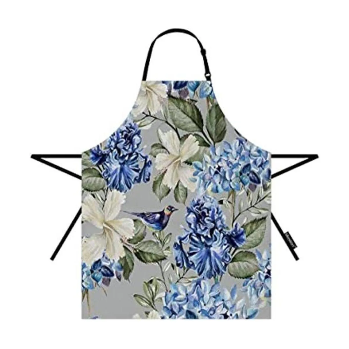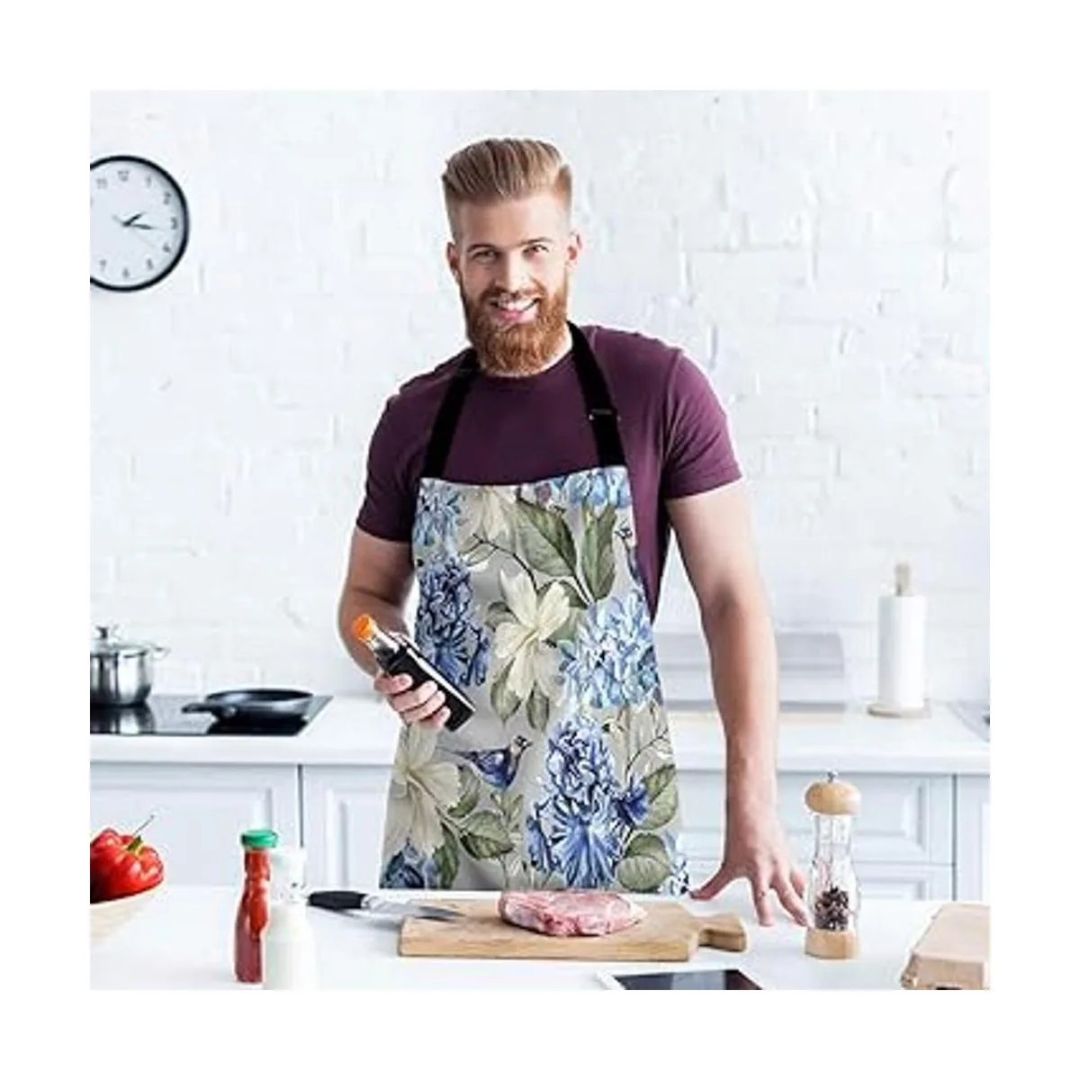 Moslion Delantal floral de 31 x 27 pulgadas, flores de primavera, hortensia, hibisco, iris, hoja de pájaro, cocina, cocinero, camarera, cocinero, delantal con cuello ajustable para mujeres, hombres y niñas, azul verde