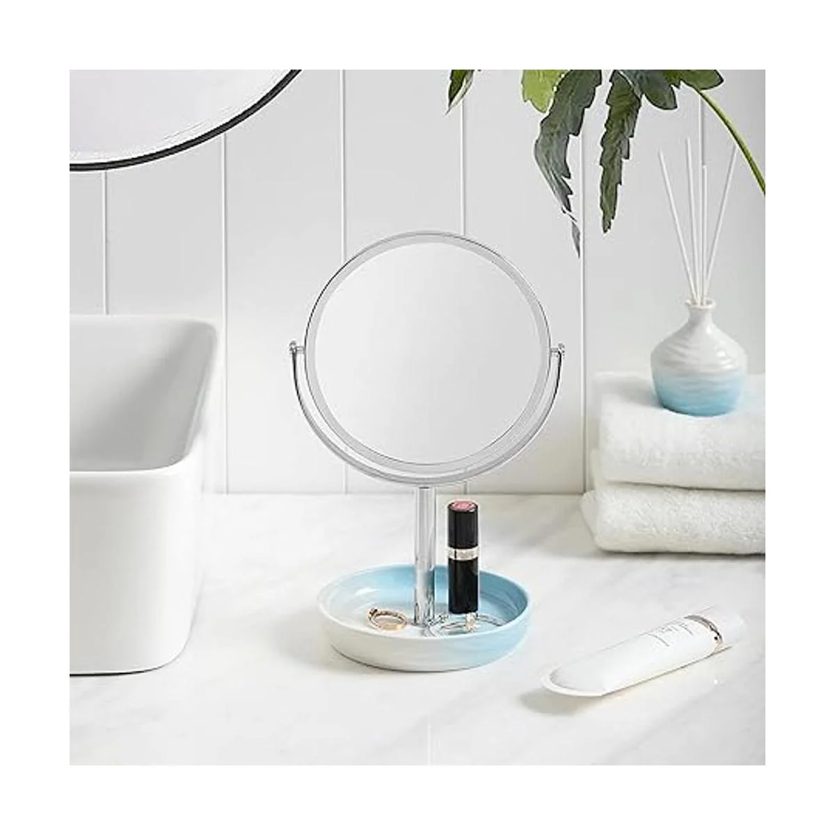 Tamaño cuidadoso: diseño ergonómico con peso perfecto que ofrece estabilidad y evita que se vuelque. Añade belleza y funcionalidad a tu baño, dormitorio, encimera, tocador, mesita de noche, tanque de inodoro o soporte para pequeños artículos decorativos. Diámetro del espejo: 5.9 pulgadas, diámetro de la bandeja: 5.3 pulgadas, altura del juego 11 pulgadas.