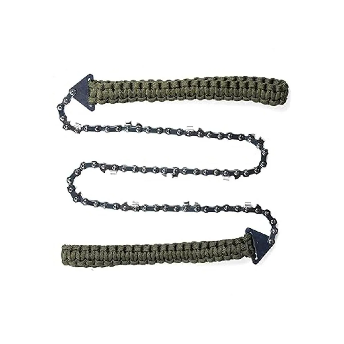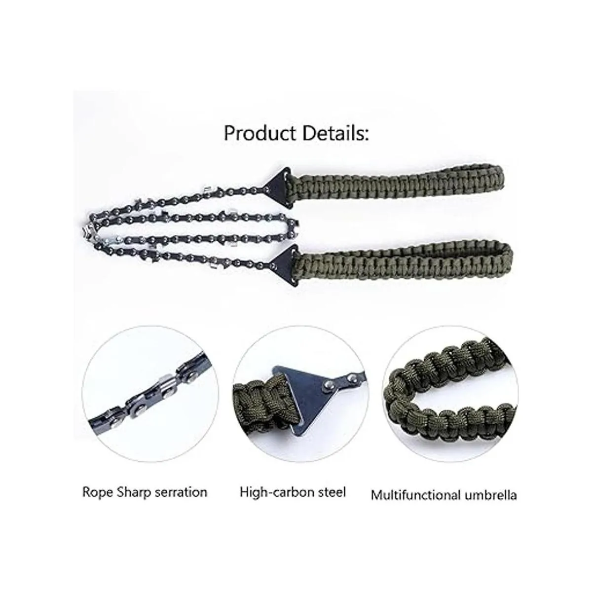 Duradero y resistente La cadena está hecha con aleación de acero Mn tratada térmicamente, más resistente y duradera, resistente a la corrosión y al óxido. Viene con dientes de corte autolimpiables y asas de paracaídas de nailon suave. No dañará tus manos ni causará ampollas. Te da una sensación más cómoda al agarrar.