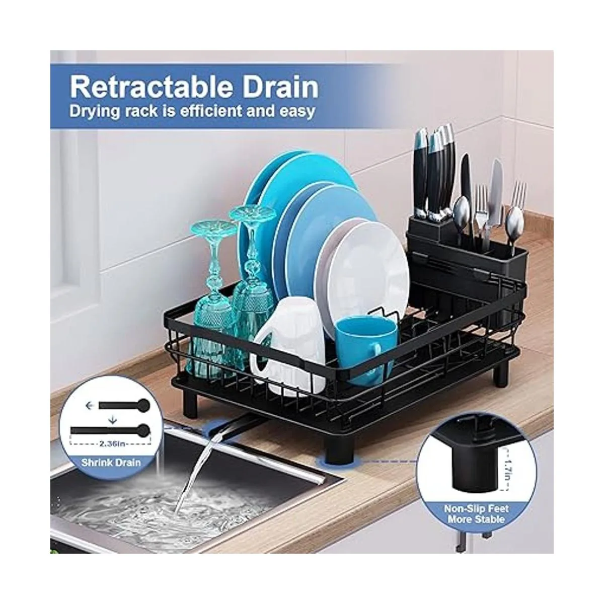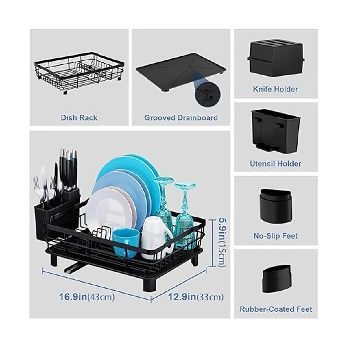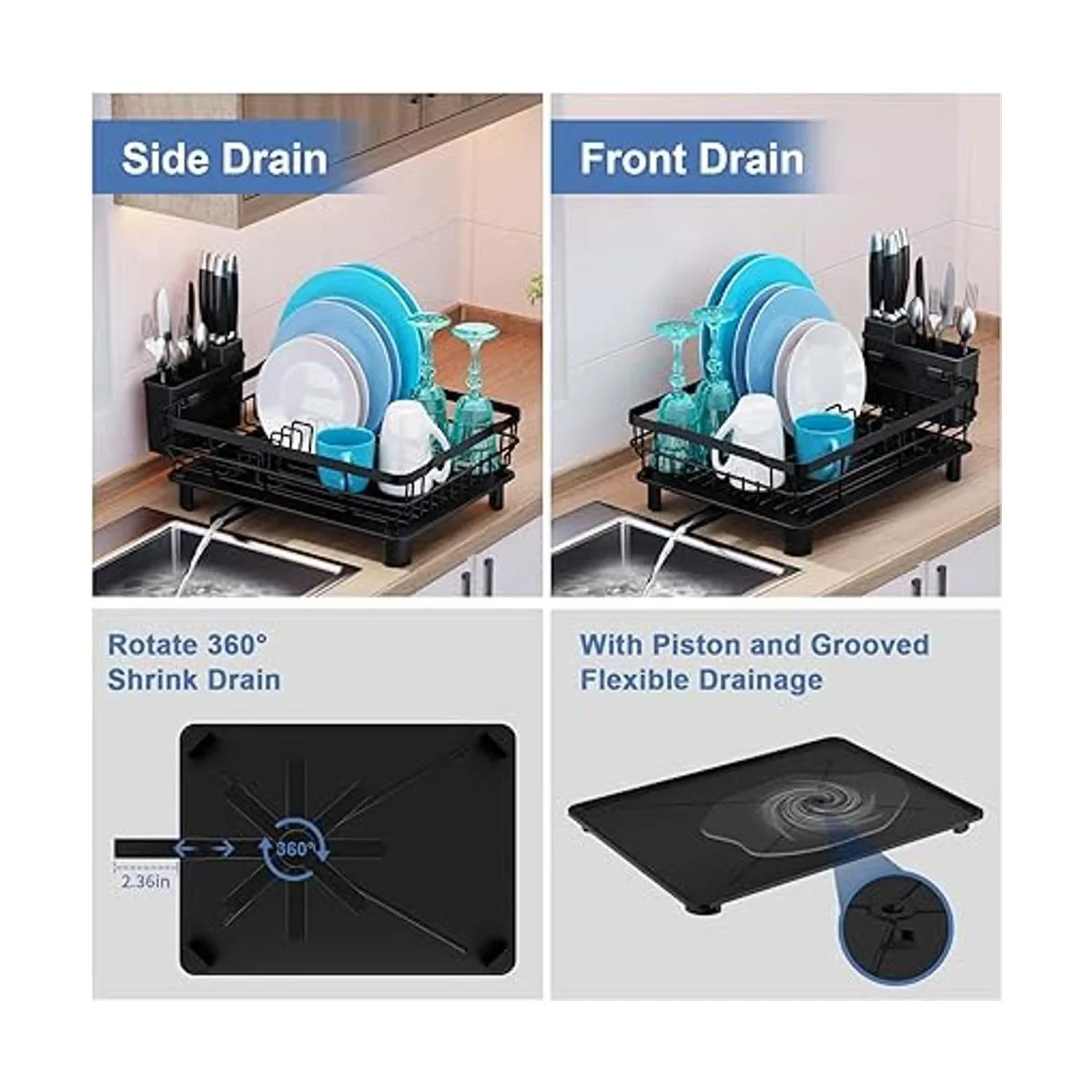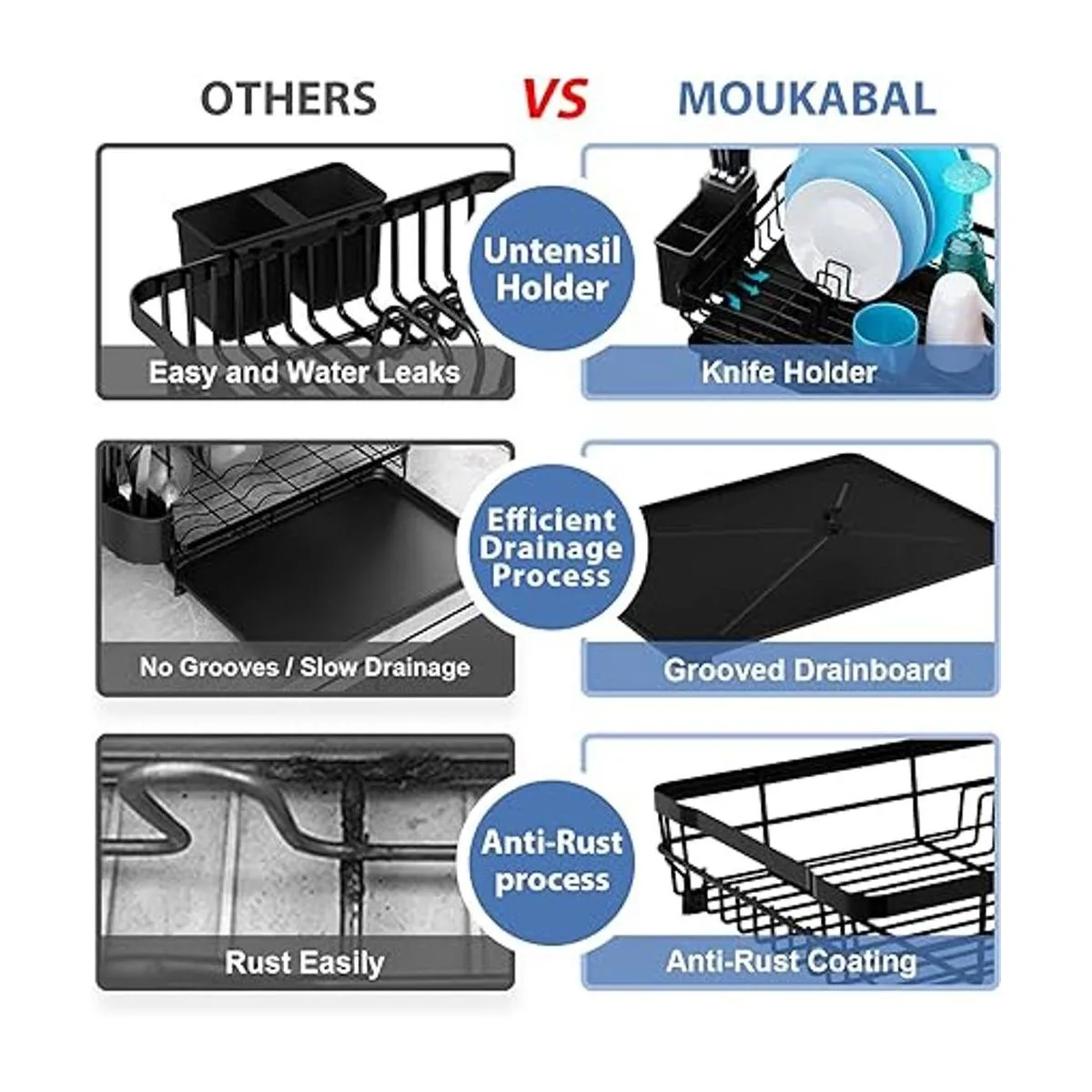 MOUKABAL Estante para secar platos, estante para platos para encimera de cocina, escurridor de platos con soporte extraíble para utensilios, escurridor de platos con escurridor y boquilla giratoria negro