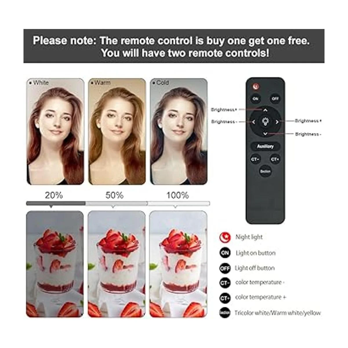2 controles remotos: puedes encender y ajustar el brillo y la temperatura de color de la iluminación de la caja de luz a través del control remoto. Ten en cuenta que la caja suave se puede ajustar fácilmente sin estar demasiado cerca de la caja suave. Además, si compras el kit de softbox, le daremos un mando a distancia adicional en caso de que uno de los mandos a distancia se rompa.