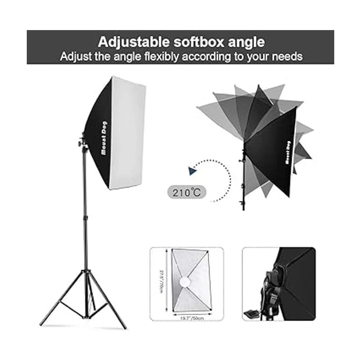 Cabezal giratorio de 210 y soporte ajustable: la caja suave de estudio tiene una perilla de bloqueo independiente, que se puede girar 210 para adaptarse a diferentes ángulos. La parte superior está equipada con montaje de tornillo de 1/4, y el soporte de trípode con diseño de columna de 3 secciones se puede extender de 26 a 78 pulgadas.
