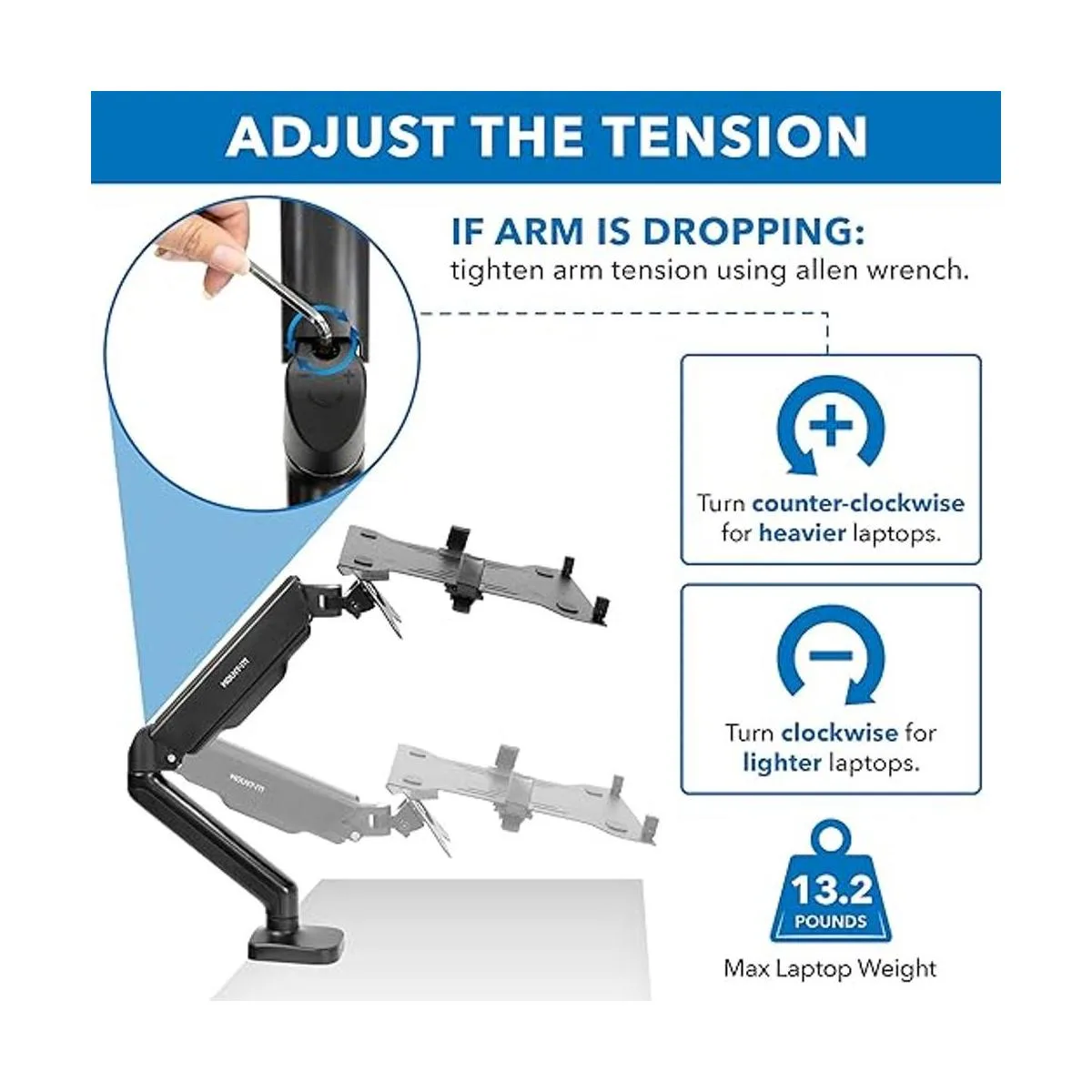 Soporte para portátil de movimiento completo: con múltiples articulaciones de brazo, este brazo articulado para portátil permite un fácil ajuste de la altura y la dirección de la bandeja sobre el escritorio. Brazo de resorte de gas con columpio de 360 grados, longitud máxima de extensión de 19.5 pulgadas, rango de inclinación de 145 grados y elevación máxima de 19.8 pulgadas. Ajusta la tensión del resorte de gas si el ajuste de altura no funciona.