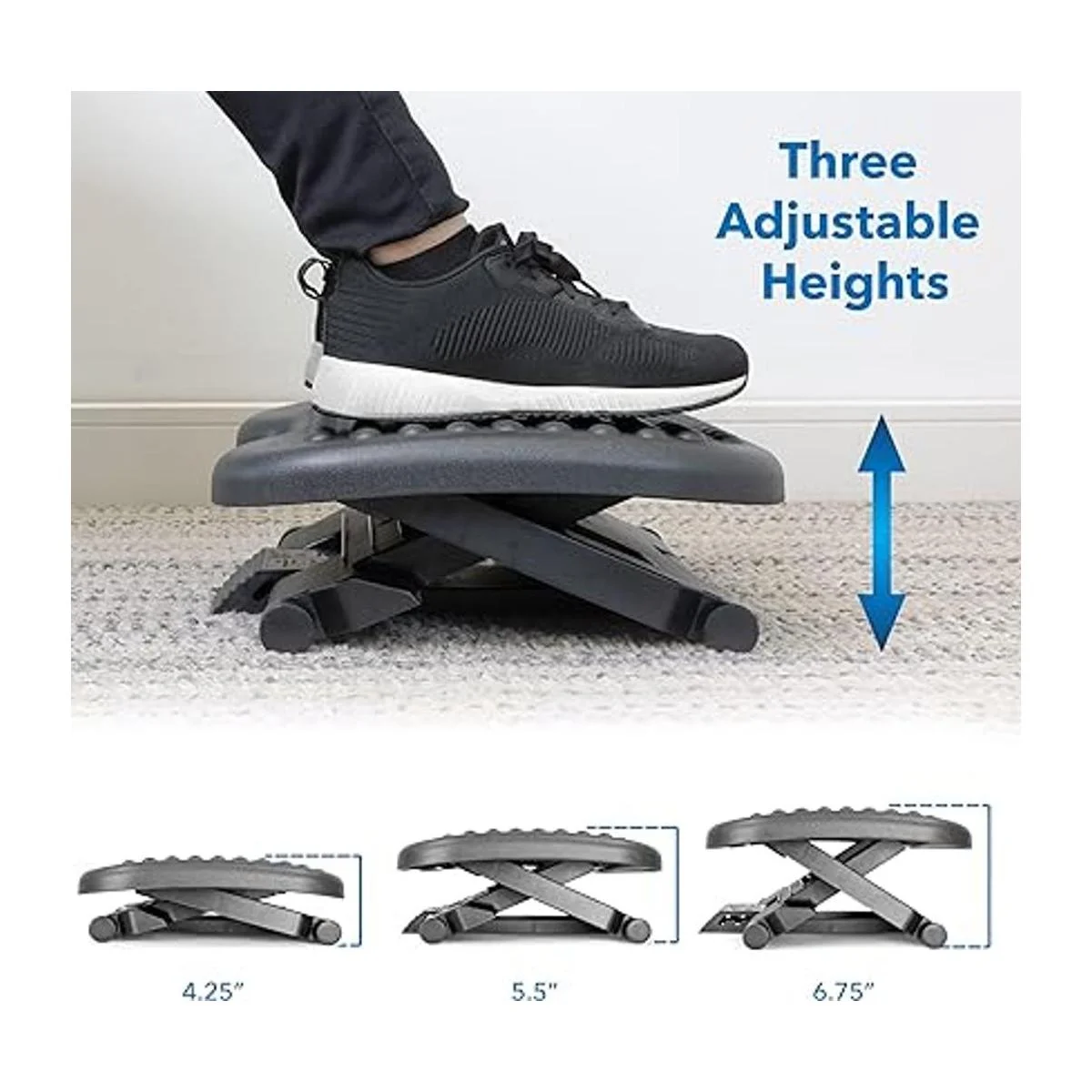 Taburete de altura ajustable: el práctico control de pedal te permite ajustar el reposapiés sin salir de tu silla. Ofrece tres niveles de ajuste de altura 4.3 pulgadas. 5.5 pulgadas. 6.7 pulgadas. que te permite estirar las piernas para una mayor circulación.