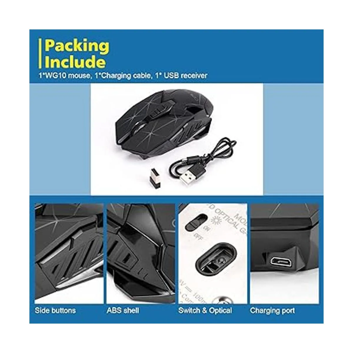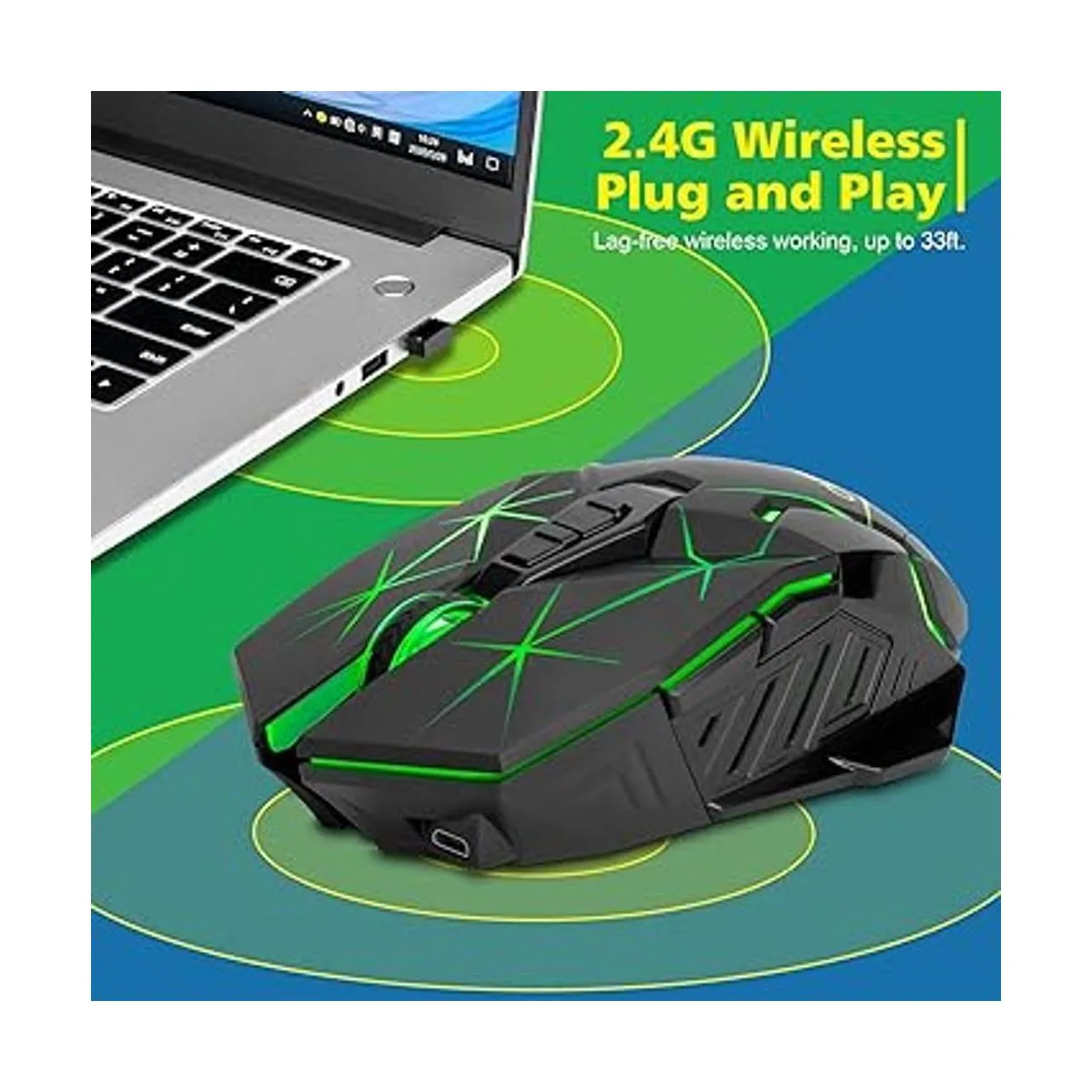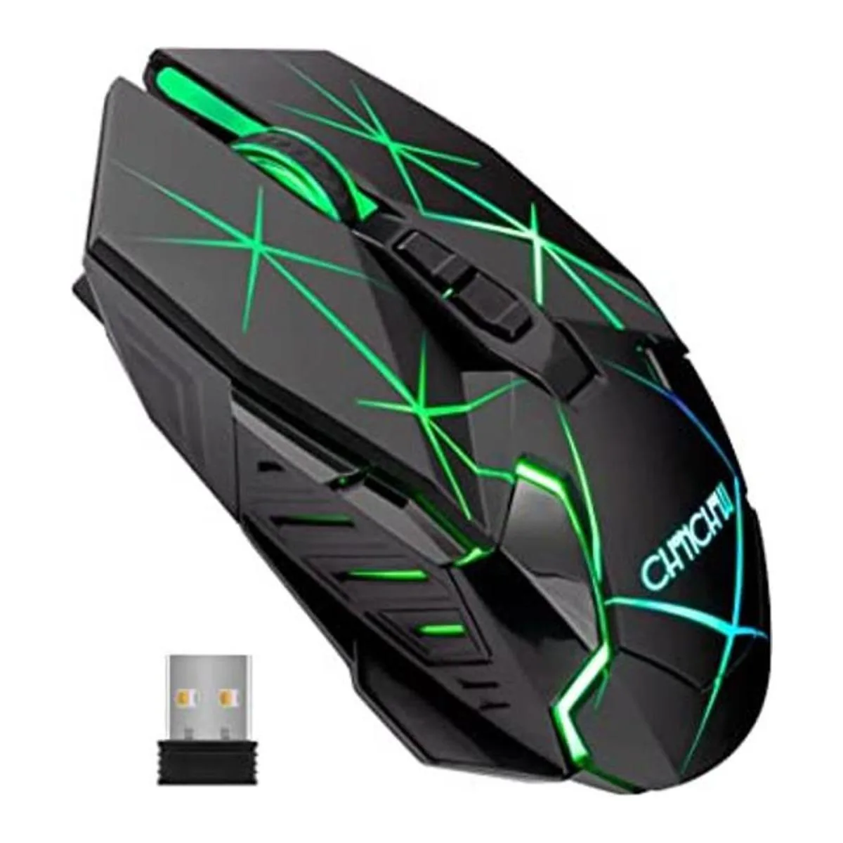 Receptor USB inalámbrico de 2.4 G: el mouse para juegos adopta tecnología de transmisión de 2.4 GHz, proporcionando una conexión fiable, precisa y de largo alcance. La respuesta es casi instantánea. Una mayor tasa de respuesta en competiciones de juegos puede jugar mejor el rendimiento del mouse y permite que el mouse tenga cero retrasos y no salte durante los juegos feroces, lo que es más realista para los jugadores de juego. El receptor USB está en la parte inferior del mouse.