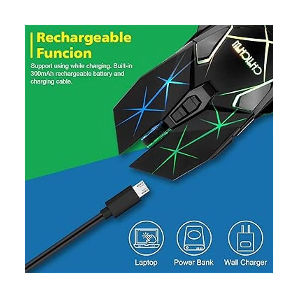 Retroiluminación de respiración RGB de 7 frescos: el mouse para juegos tiene un diseño de aspecto único con efecto de respiración RGB arcoíris. Hace que el mouse se vea realmente genial, lo que es más apasionado y agradable para los jugadores. Si no quieres la luz, puedes apagarla con un interruptor en la parte inferior del mouse. El modo de luz acelerará el consumo de la batería, apagará la luz mientras no utilices el mouse