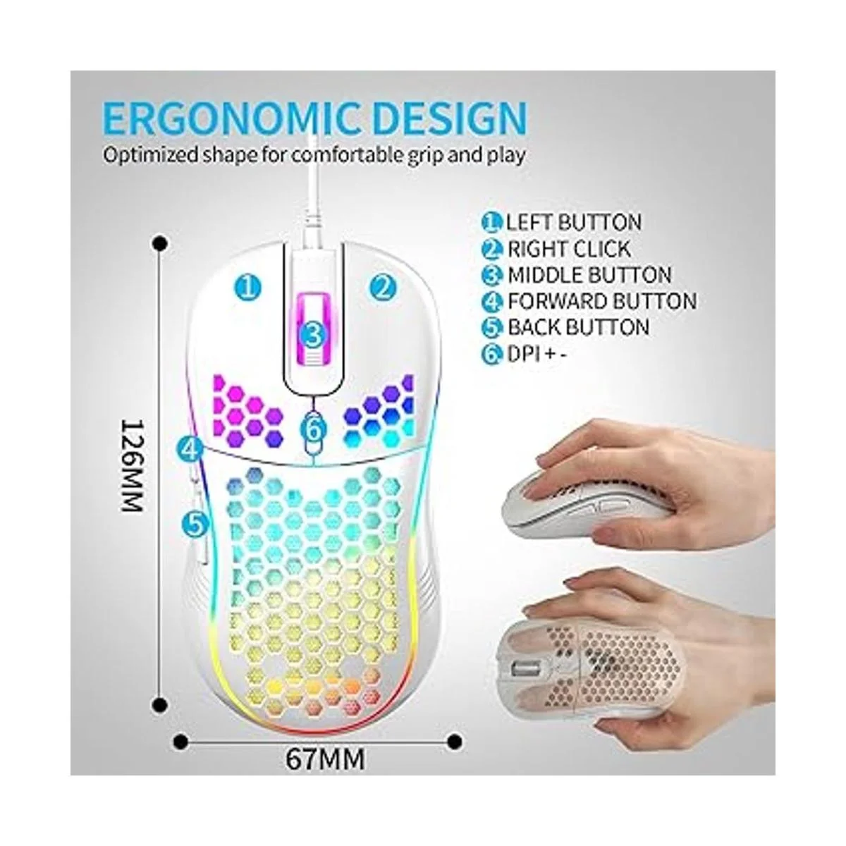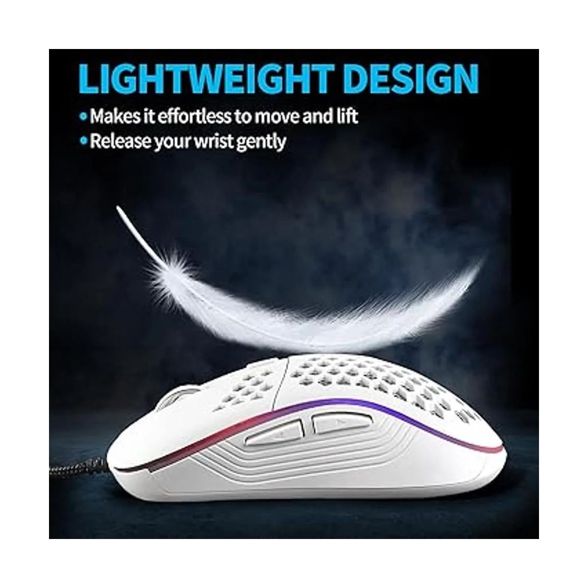 Mouse para juegos con cable de panal de abeja, retroiluminación RGB y 7200 DPI ajustable, mouse ergonómico y ligero con sensor de alta precisión para jugadores de PC y portátiles con Windows blanco