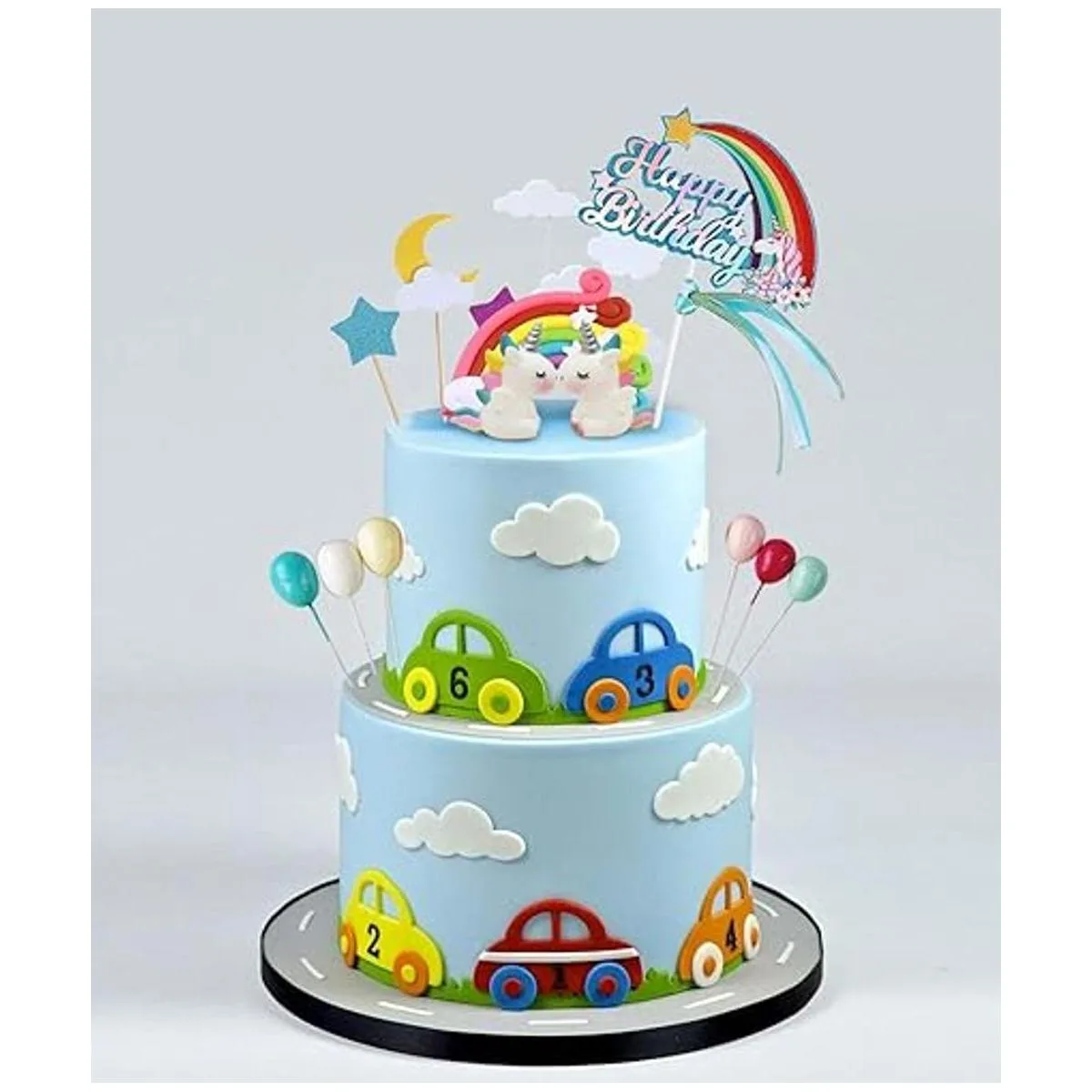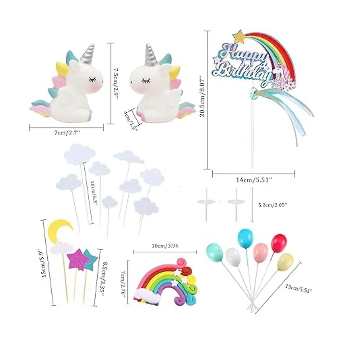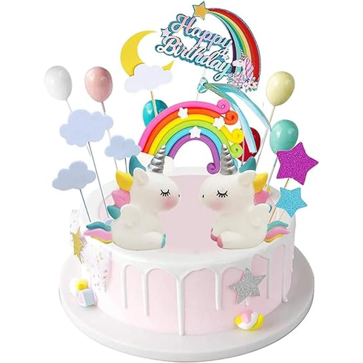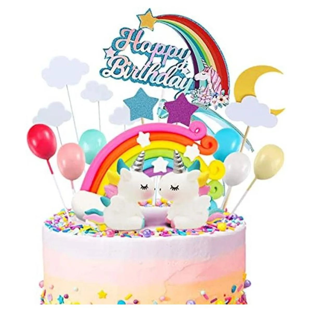 Decoraciones para tartas de cumpleaños de unicornio que incluyen: 2 unicornios, 1 arco iris, 6 globos, 8 nubes, 1 luna, 2 estrellas, 1 bandera de feliz cumpleaños, 2 palos de apoyo. Se adapta mejor a pasteles de 6 a 10 pulgadas.