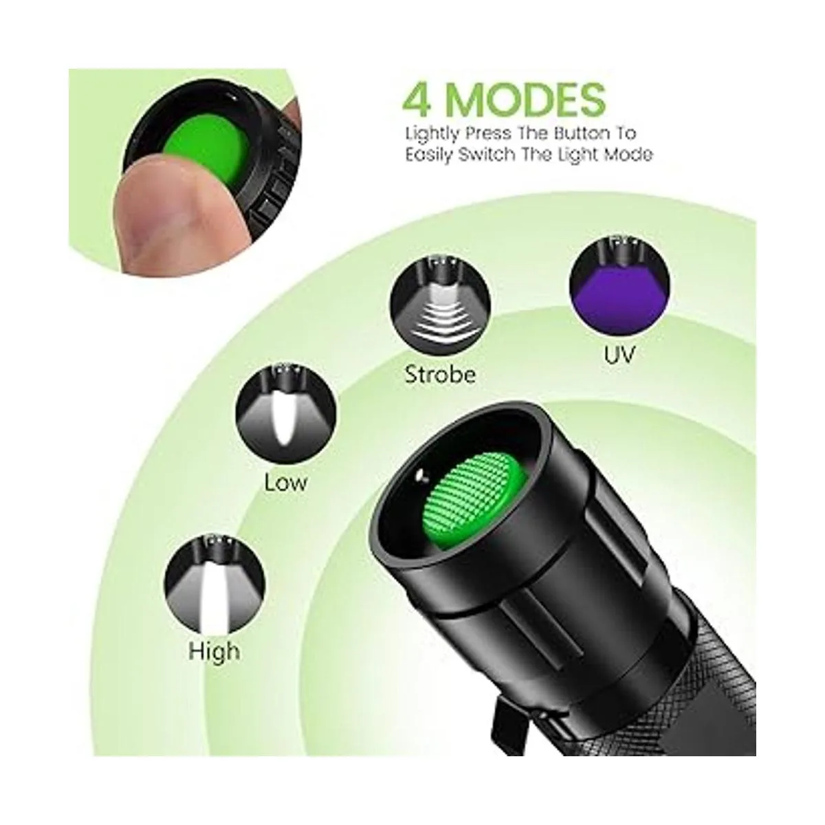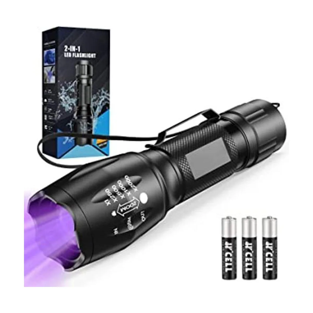 2 en 1 y 4 modos de iluminación: esta linterna LED tiene una combinación de luz blanca y luz negra. Además, viene con 4 modos como luz UV, luz blanca alta y baja y modo SOS. Los cambias fácil y rápidamente de acuerdo a diferentes escenas.