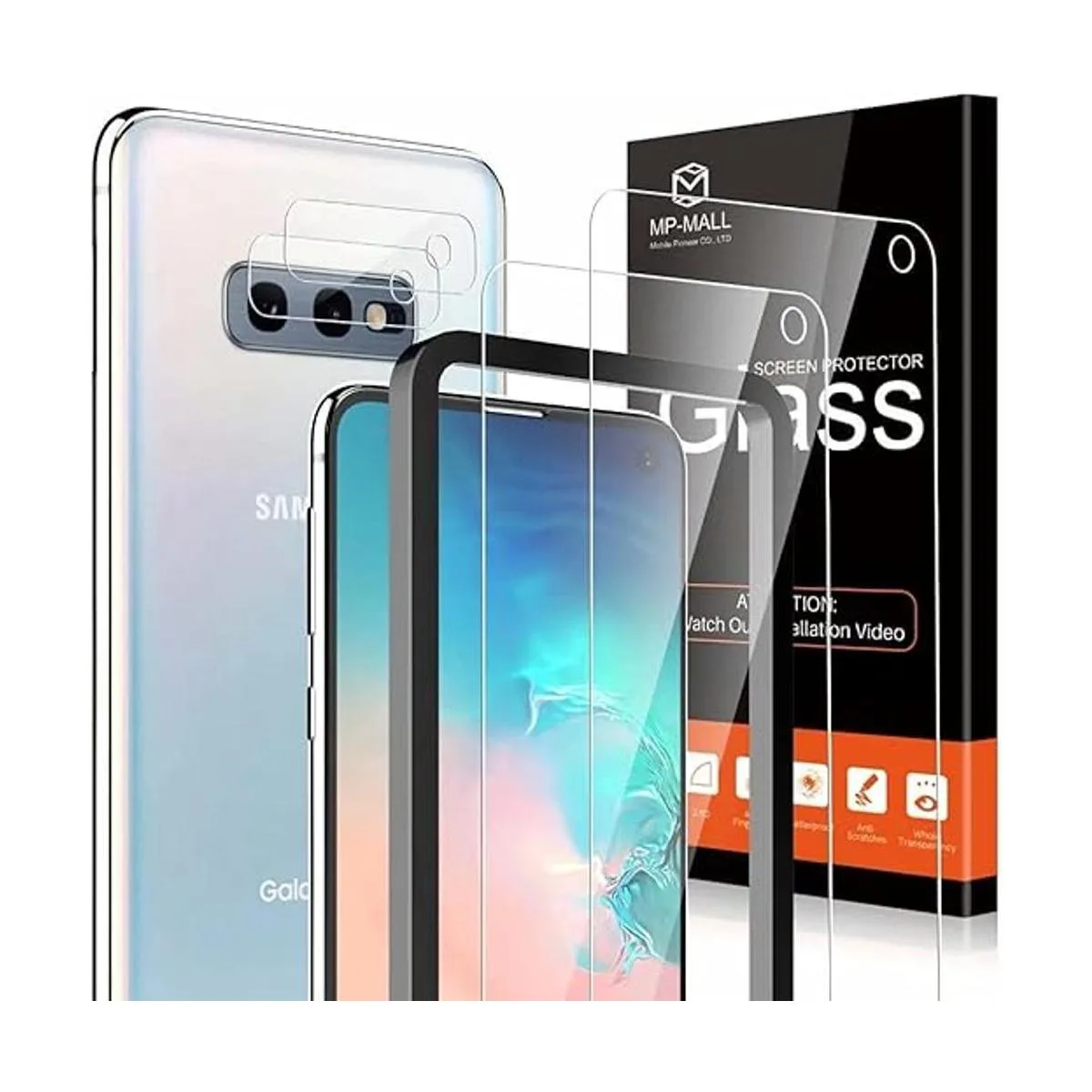 MPMALL Paquete de 2 protectores de pantalla de vidrio templado 2 protectores de lente de cámara compatibles con Samsung Galaxy S10e, no apto para Galaxy S10 o S10 Plus, marco de instalación, dureza 9H