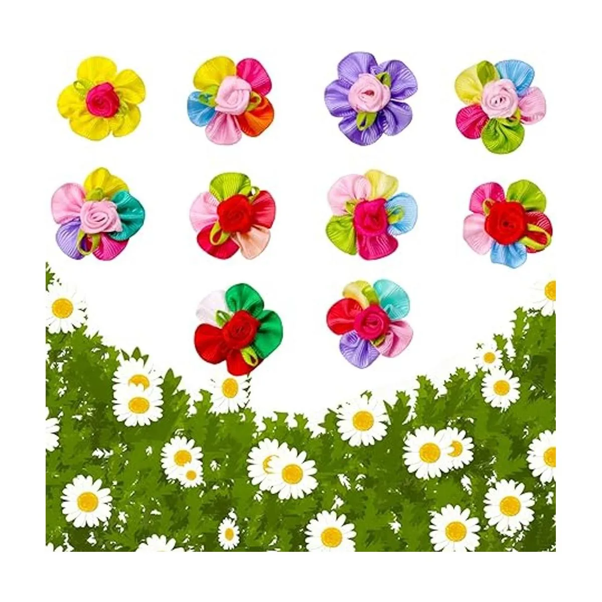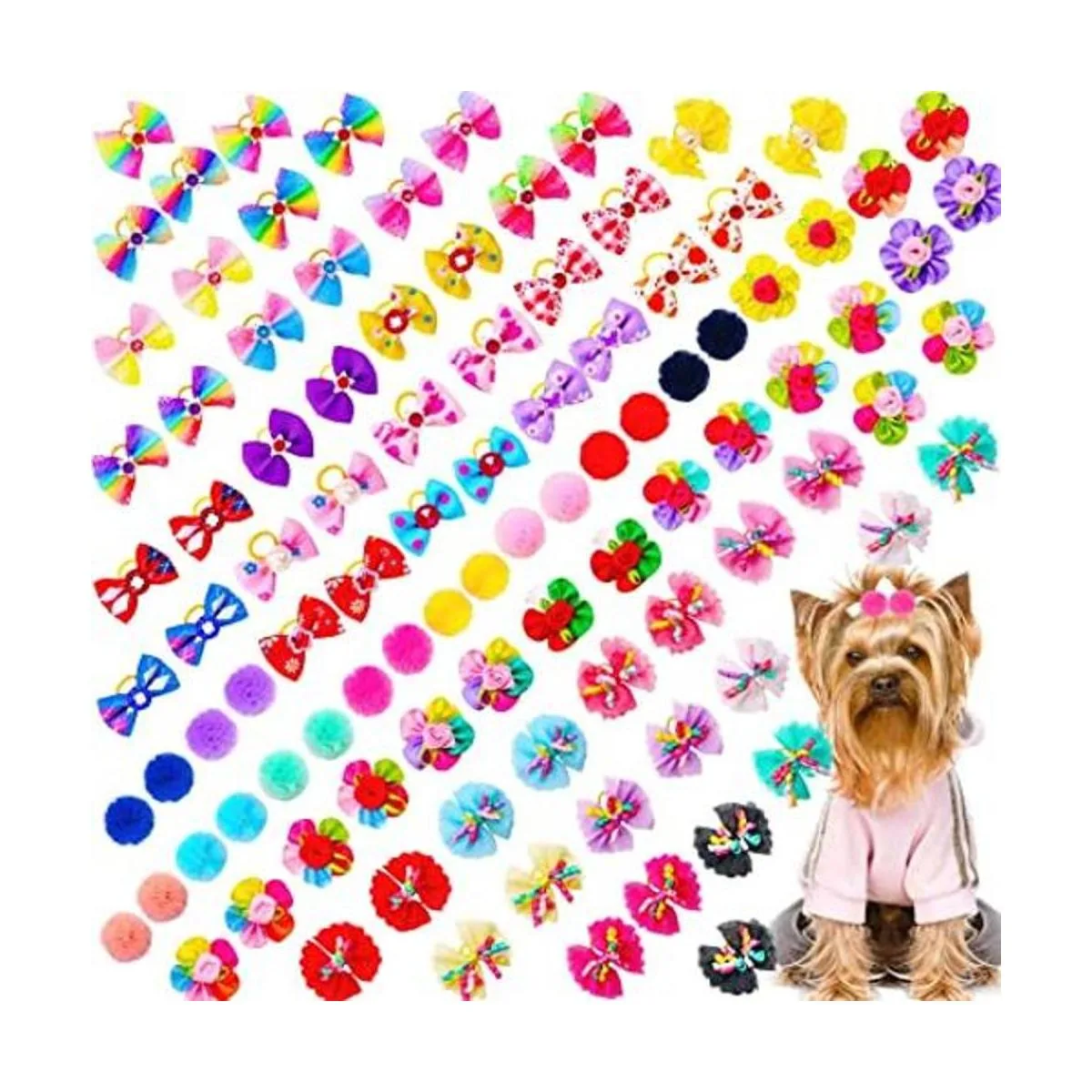 Mruq pet 100 lazos para el pelo de perro con bandas de goma, mezcla a granel lazos de aseo de perros, cinta de encaje, hechos a mano, bonitos lazos Yorkie con diamantes de imitación para mascotas y cachorros, accesorios de moño