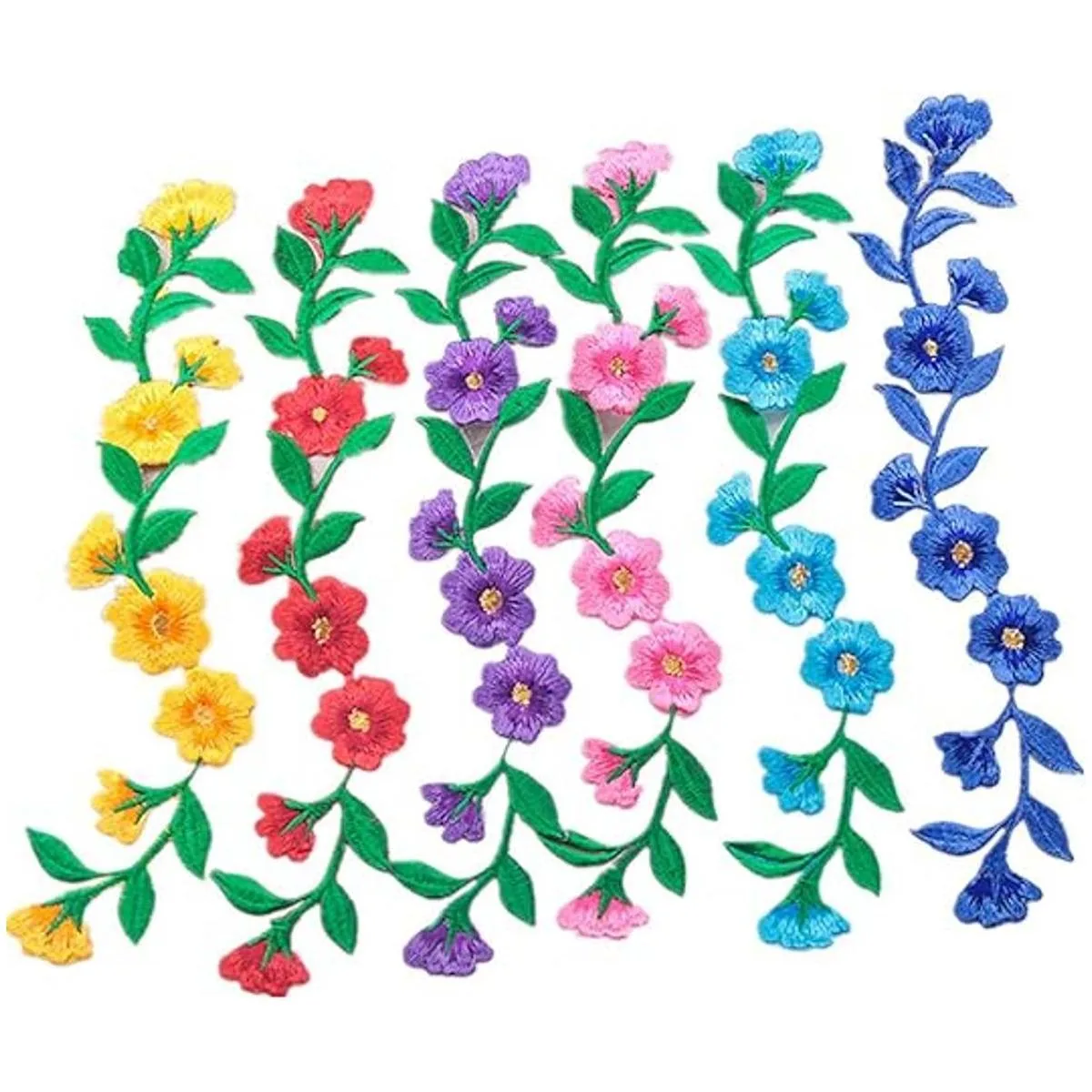 6 parches de coronas florales con hojas verdes, 9.4 in de largo, 2.0 in de ancho. Hay rojo, rosa, dorado, azul real, azul cielo, morado 6 colores disponibles. Perfecto para decoraciones de accesorios de ropa.