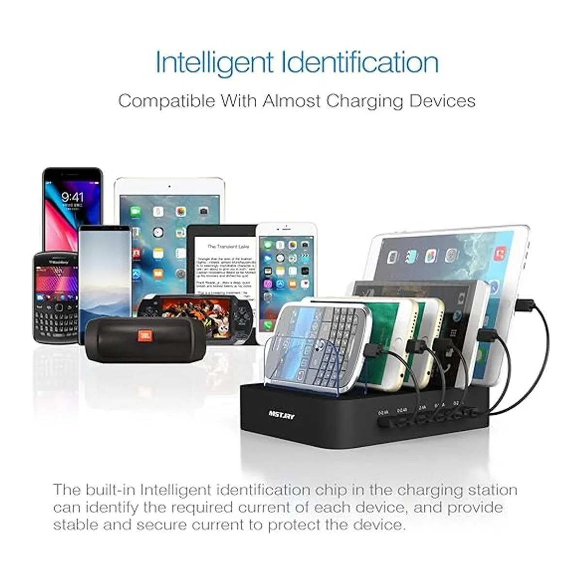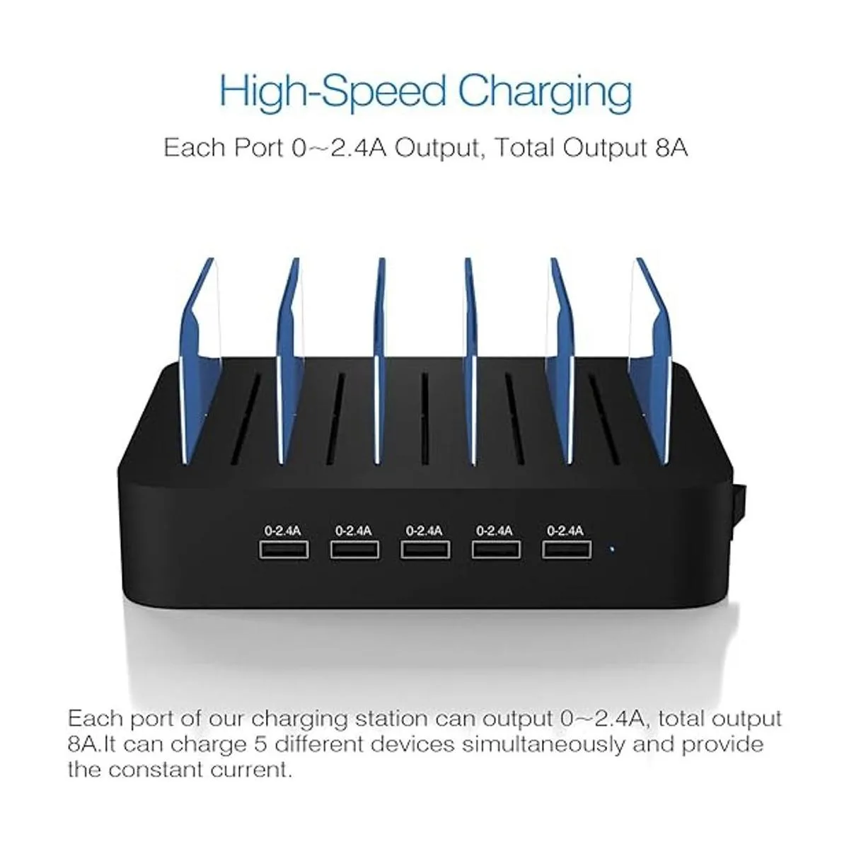 Rápido e inteligente: esta estación de carga para múltiples dispositivos cargará tus smartphones, tabletas hasta un 80 que otras estaciones de carga USB con 2.0 A o menos. Nuestra estación de carga múltiple detectará automáticamente tus dispositivos y ajusta el voltaje para un tiempo de carga mínimo.