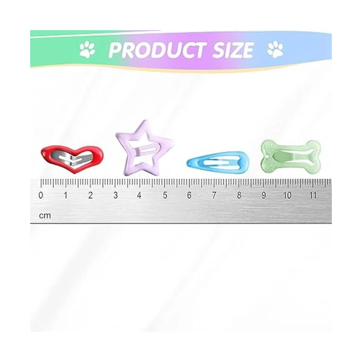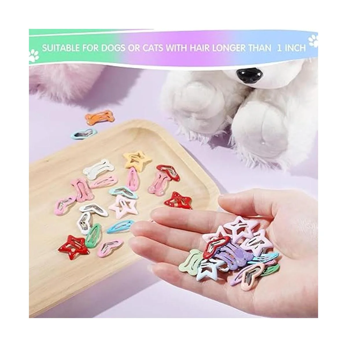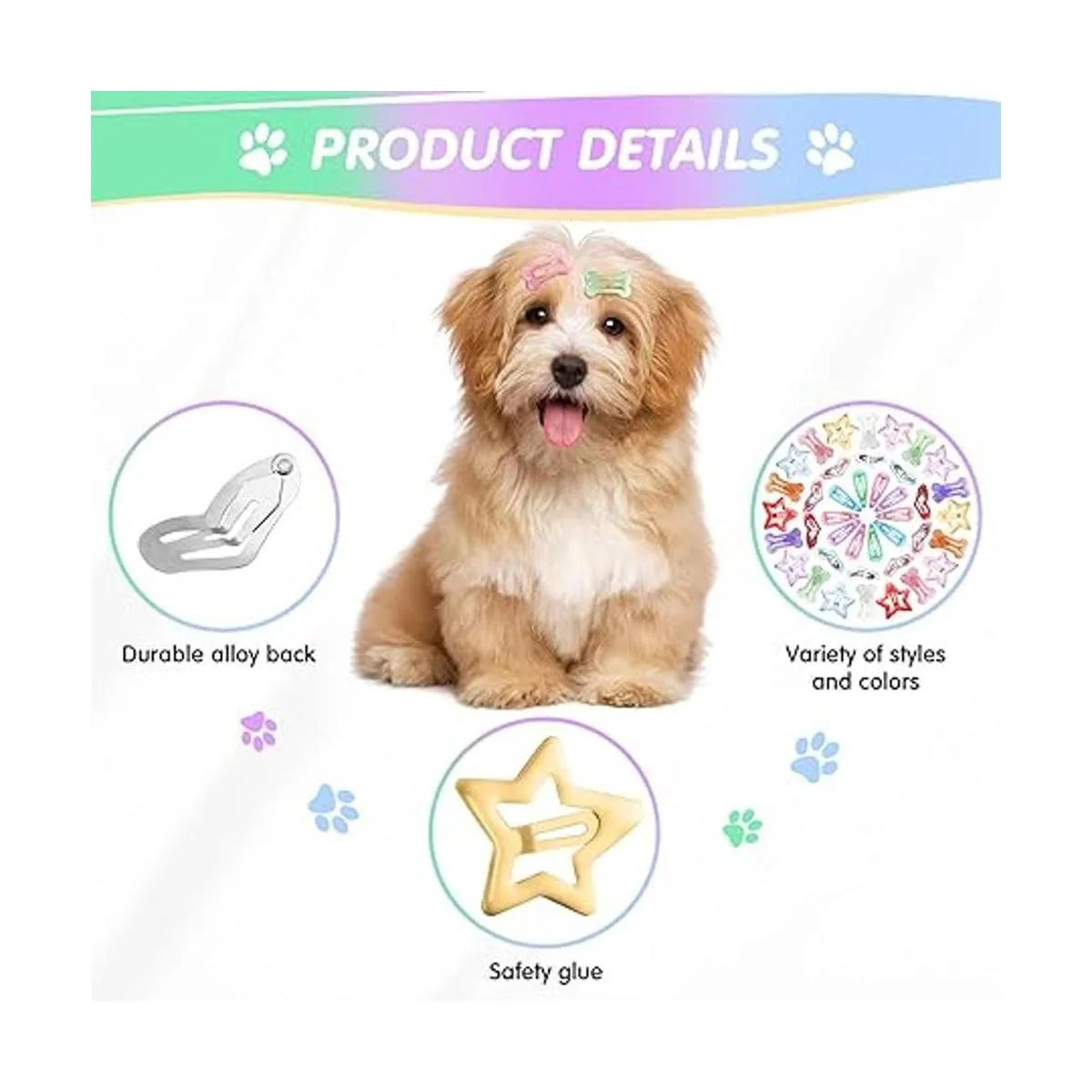 Diseño bonito: los clips de pelo para perro están diseñados con 4 estilos diferentes, incluyendo estrella de cinco puntas, hueso, forma de corazón y forma clásica de gota, con varios colores brillantes, los clips de pelo para mascotas se ven bonitos y elegantes, haciendo que tus mascotas destaquen de la mochila