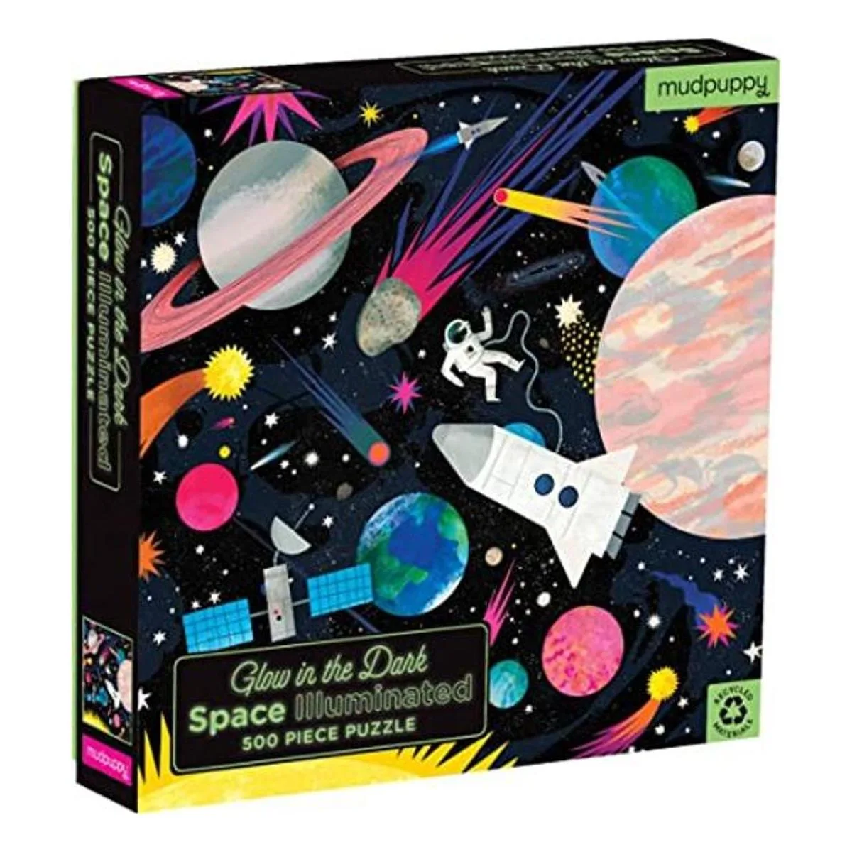 Mudpuppy Rompecabezas de 500 piezas con iluminación espacial que brilla en la oscuridad para niños y familias, rompecabezas familiar con tema de espacio que brilla en la oscuridad