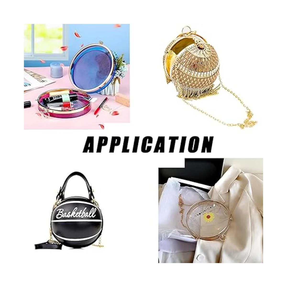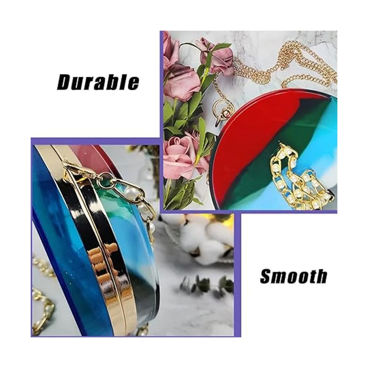 Fácil de usar: fija la película de PVC en ambos lados del marco de metal, luego usa pegamento UV para fijar el trabajo de resina epoxi moldeada en el marco de metal. Espera a que el pegamento se enfríe y se solidifique y luego abrocha las cadenas, obtendrás una bolsa única de bricolaje.